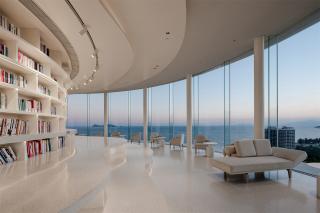 建筑師希望將室內(nèi)營造為一組具有序列感的,亮與暗,開與閉交疊的戲劇性空間。人進入建筑的第一個場景是玄關(guān),它位于室外走廊的盡頭,這是一個相對狹小的過渡空間。從玄關(guān)左轉(zhuǎn),進入位于建筑中部的圓形空間,空間的界面樸素,具有禪意。建筑師希望這里是神秘的、暗的,它為進入閱讀區(qū)域提供了前導(dǎo),也可以在此舉辦一些小型的展覽或者聚會。暗空間有“洞口”與閱讀空間相連,后者位于建筑的外圈,是一個明亮的半環(huán)形空間。它具有近270度的落地玻璃,透明且開放,可以看到碧空和大海。