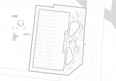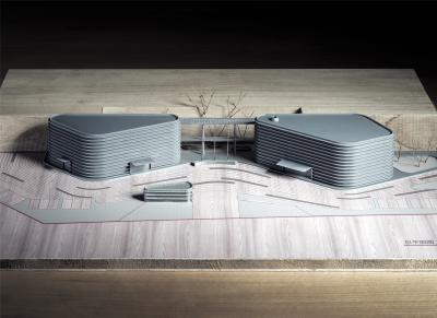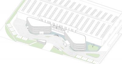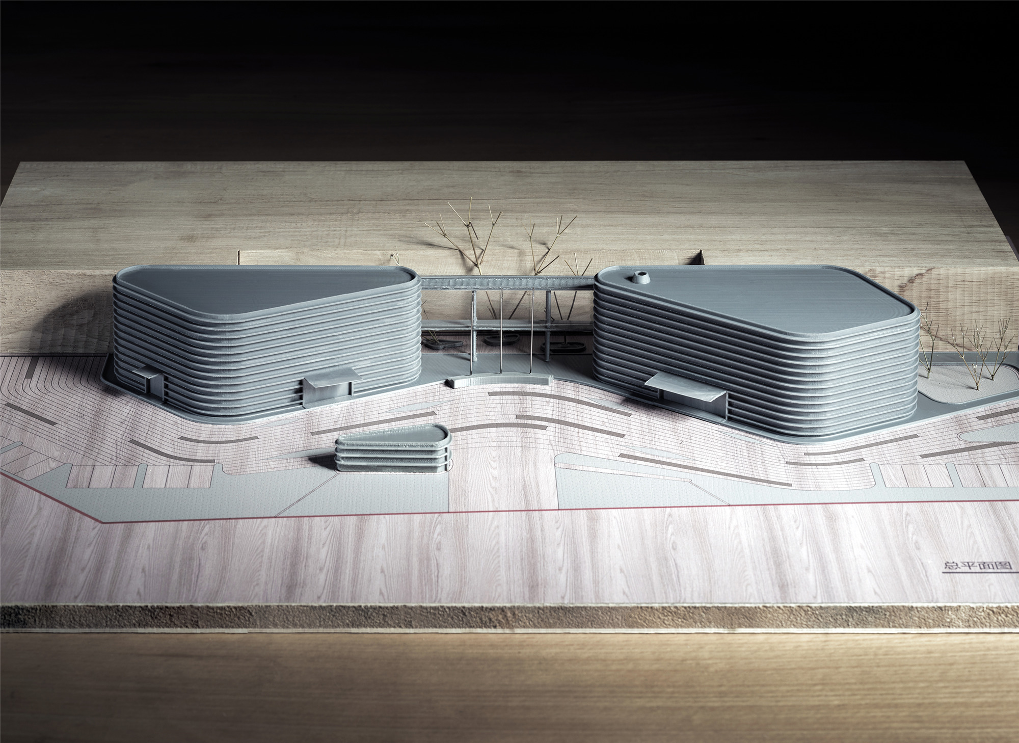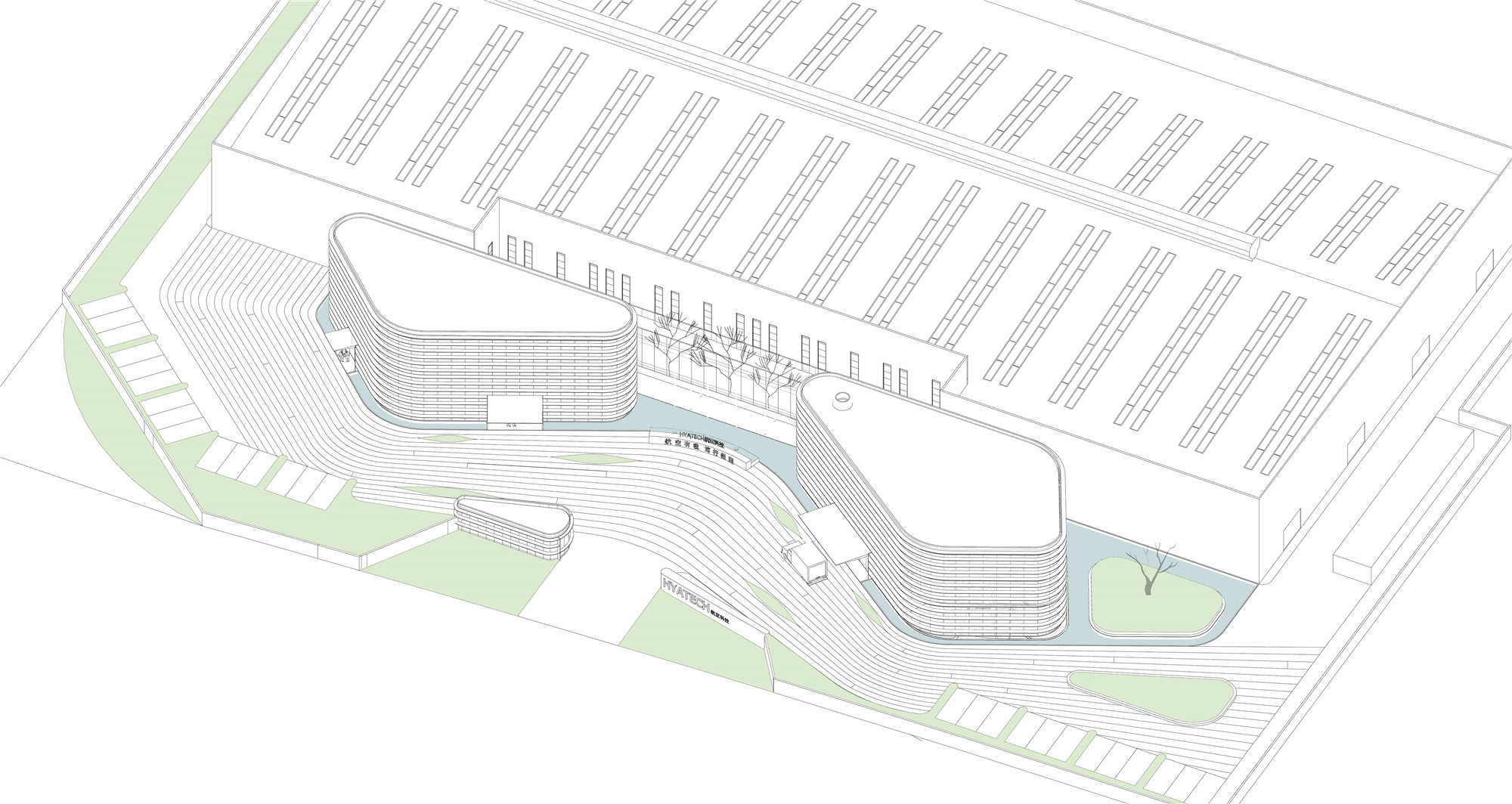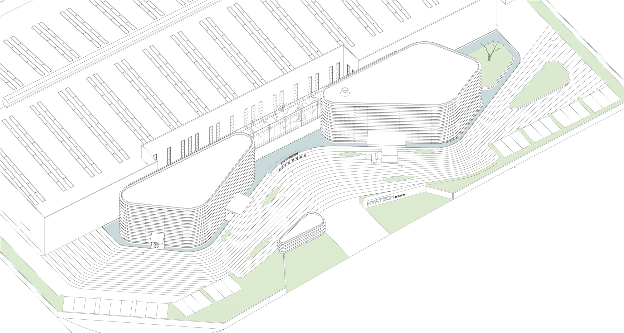 ▼流線建筑體之間圍合出內(nèi)凹的廠前區(qū)廣場