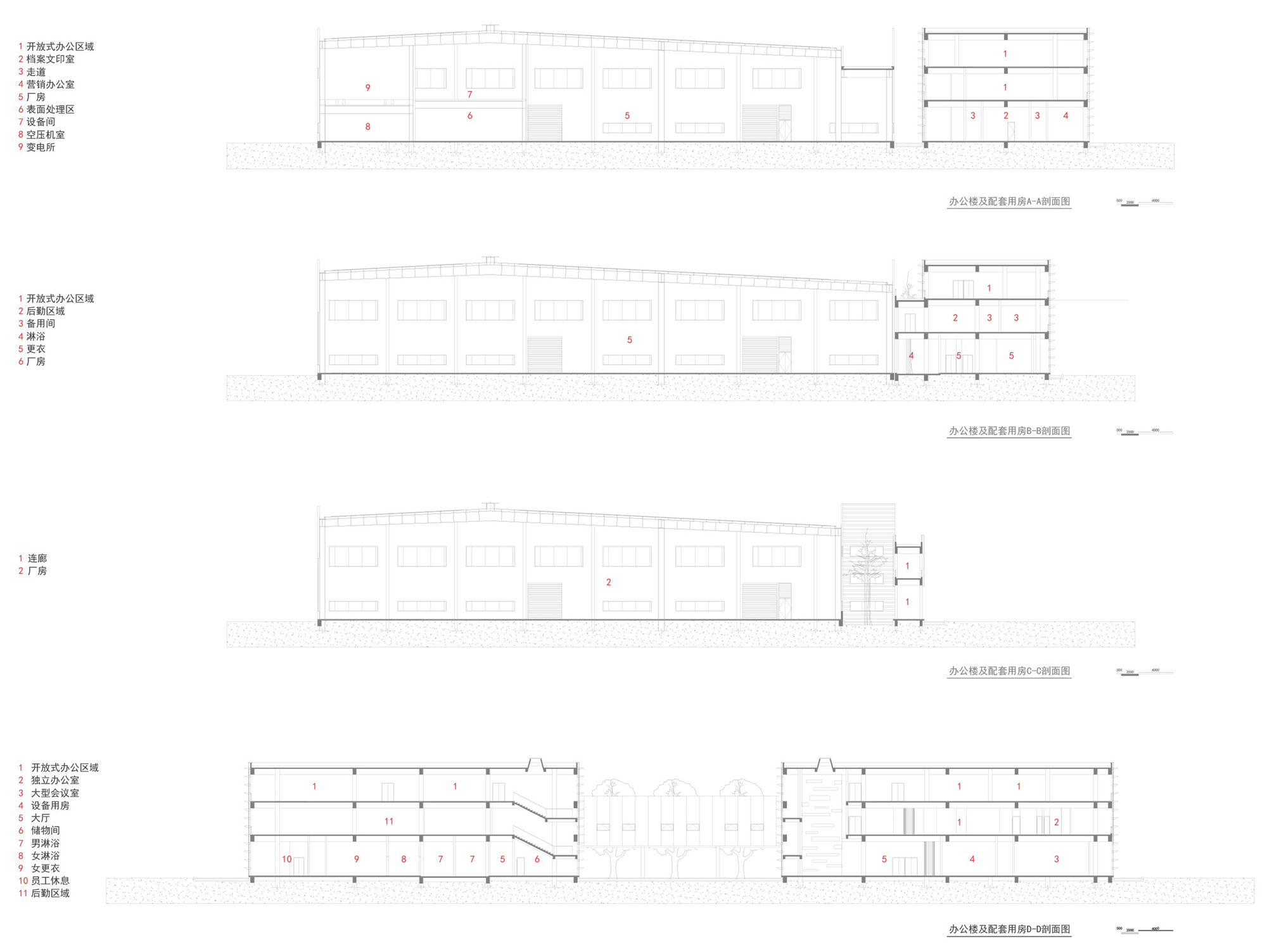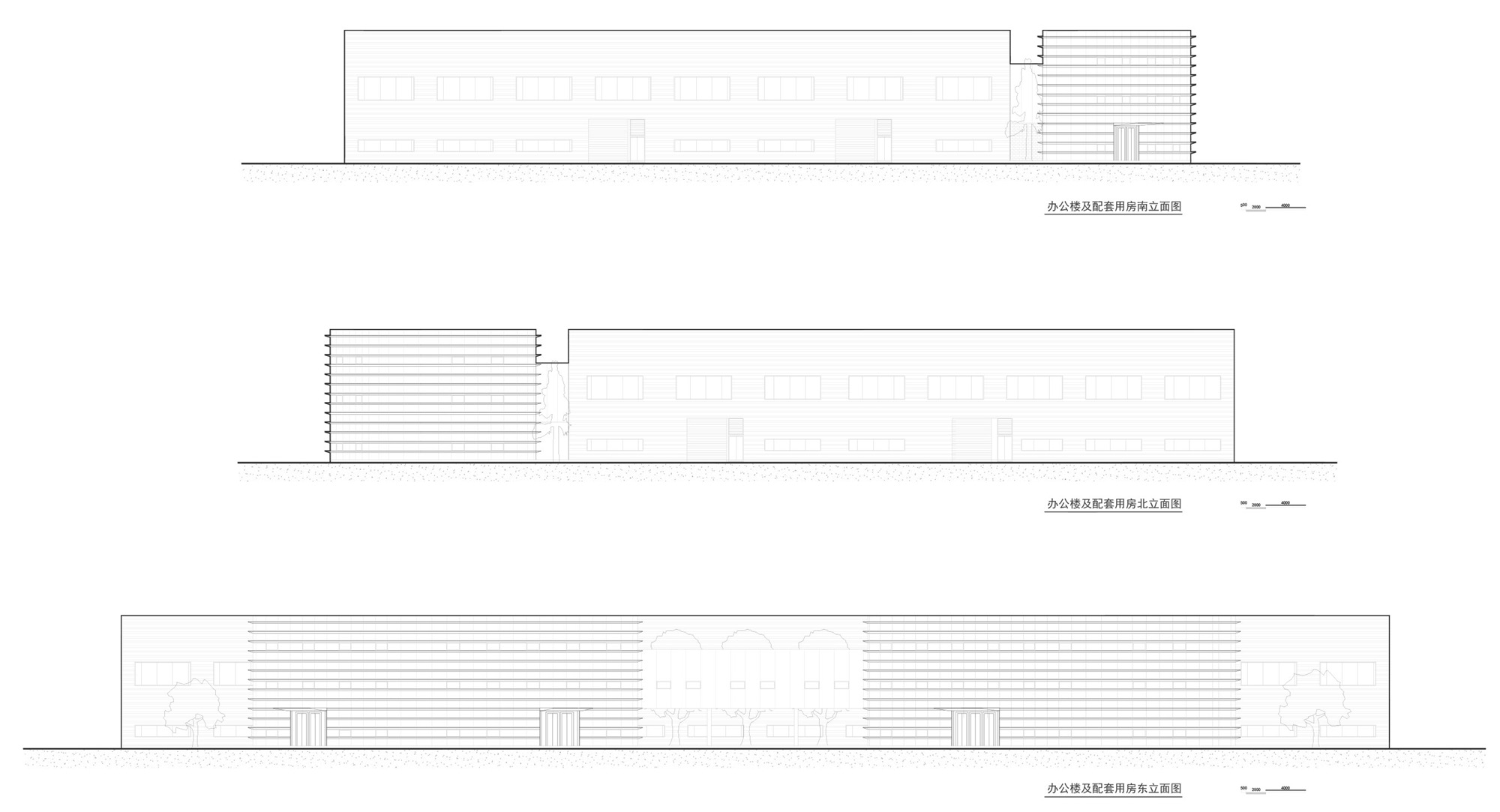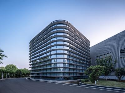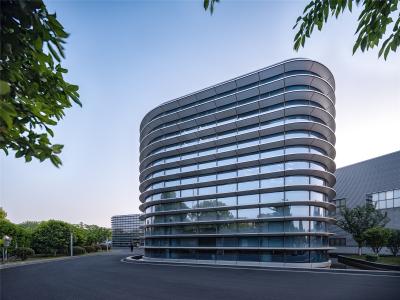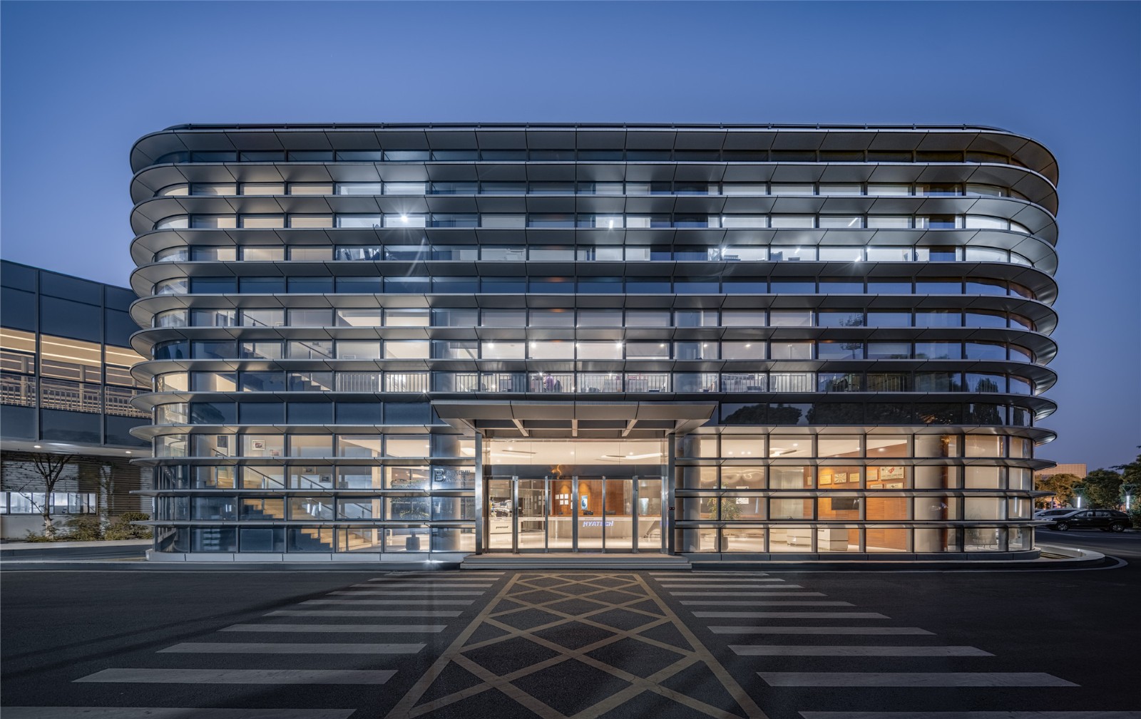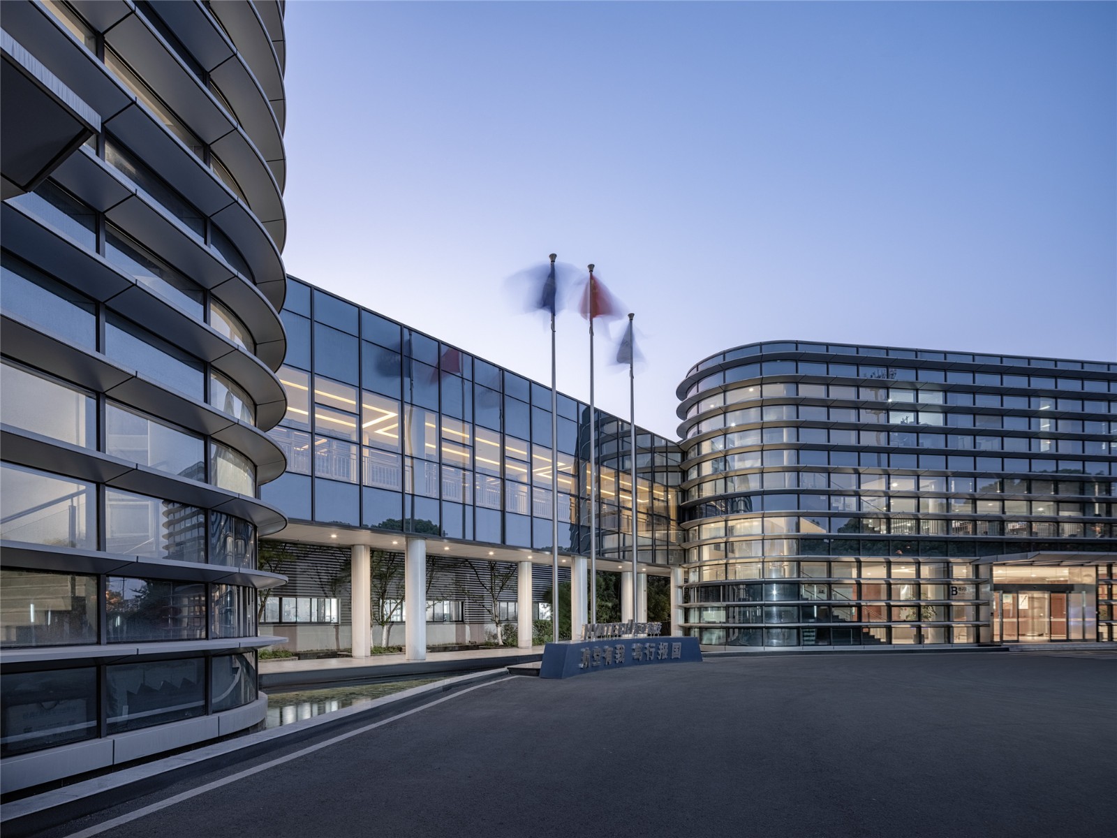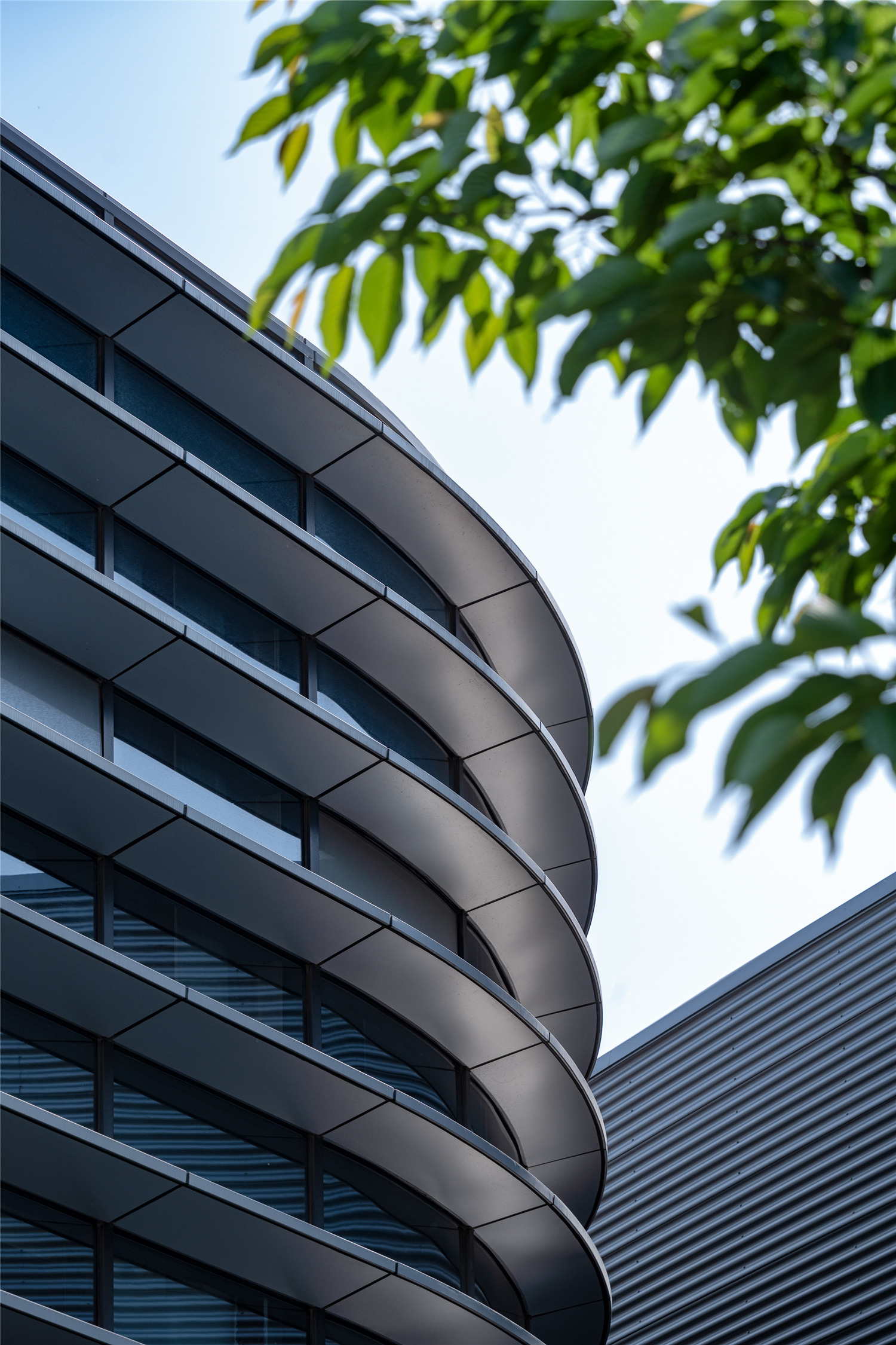 流線型的建筑體采用玻璃幕墻外立面,其上均布著鋁合金水平遮陽構(gòu)件,金屬構(gòu)件的水平運動強(qiáng)化了建筑的流線感,在視覺上使公共建筑和生產(chǎn)車間保持了一致的面貌,盡管二者在立面和空間上僅僅是一些細(xì)小的造型變化,但是整個建筑的層次由于變化的介入而豐富起來,線與面的交疊,塑造了建筑獨特的形象。當(dāng)樹木逐漸繁盛,填充了那些我們留置出來的空間。透過陽光閃爍和婆娑樹影,建筑在咫尺之間映射出自然的豐富。