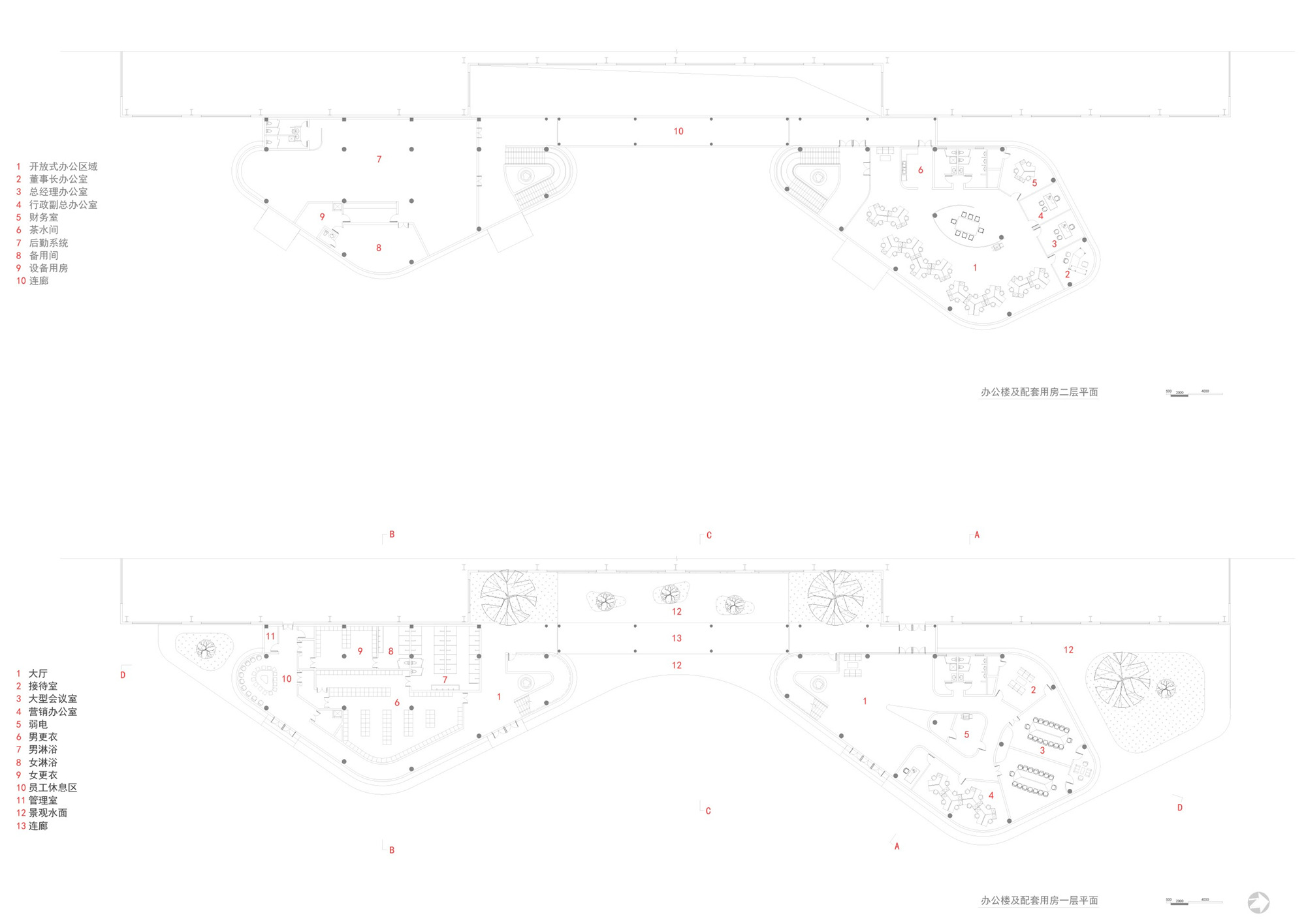 標(biāo)準(zhǔn)車間以鋁合金波紋板為外立面,強(qiáng)調(diào)建筑的工業(yè)本色。前區(qū)建筑分為兩個部分,一部分為辦公、研發(fā)和商務(wù)。另外一部分包含了餐廳和員工關(guān)懷內(nèi)容。借用了航亞科技航空類產(chǎn)品的造型和生成特點,我們將建筑與風(fēng)洞實驗中的氣體流線相結(jié)合,以流暢曲線造型自然描繪出兩棟建筑的獨特外觀,流線建筑體之間圍合出內(nèi)凹的廠前區(qū)廣場,廣場軸線布置旗桿且正對車間山墻,兩側(cè)分列的建筑體通過玻璃的連廊連接在一起。我們說服了甲方,在珍貴的車間空間中,內(nèi)凹一部分形成小小的庭院,其間中布以水景和樹池,因此玻璃連廊得以穿越庭院上空,讓人們在車間和辦公樓之間穿行的時候,能夠在不同標(biāo)高上,享受到這個在小小的方寸之間植入的珍貴的自然天地,明月半墻,桂影斑駁,風(fēng)移影動,珊珊可愛。