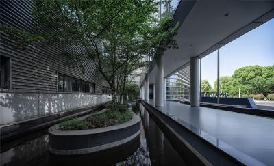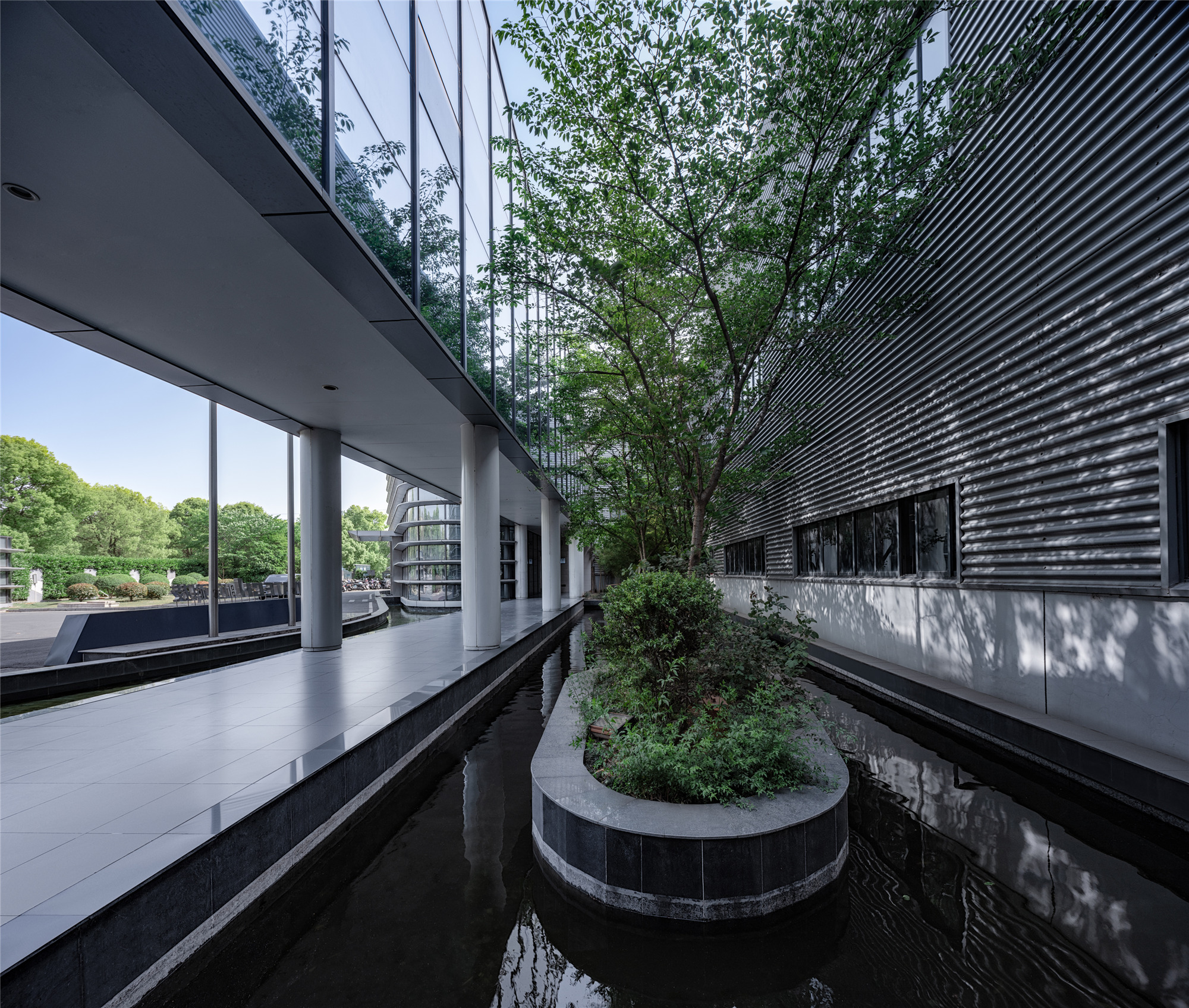 ▼車間內(nèi)凹形成小庭院,布以水景和樹池