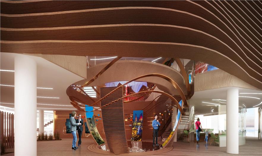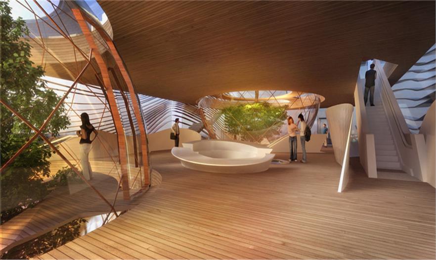展館的入口穿過一片開闊的中庭,將為活動空間增加一倍。從此處開始自動扶梯將帶您分別進(jìn)入三個不同的樓層,每一層都代表不同的生物圈環(huán)境。第一層樓的裝設(shè)主要介紹阿塞拜疆的地理情況,第二層樓則把重點放在他們國家九個不同的氣候區(qū)域內(nèi)的生物多樣性,第三層樓則聚焦于文化、傳統(tǒng)和創(chuàng)新。建筑最頂層包含有一間餐廳餐廳和露臺,在那里可俯瞰世博會展區(qū)的其他地方。