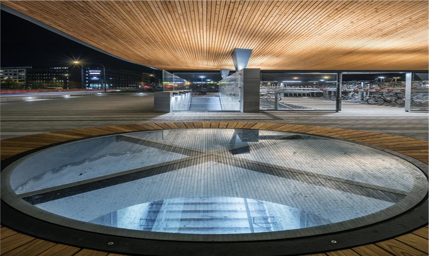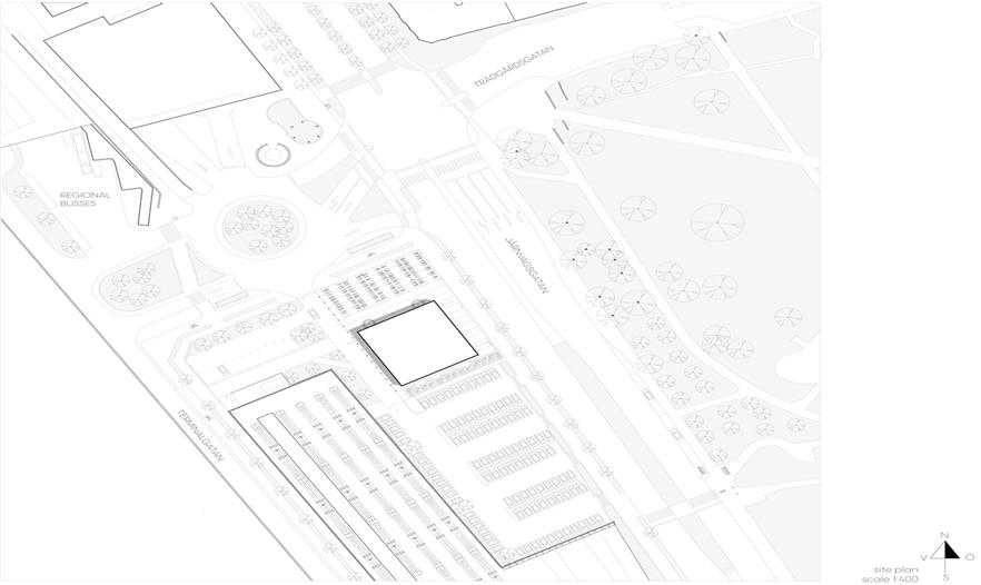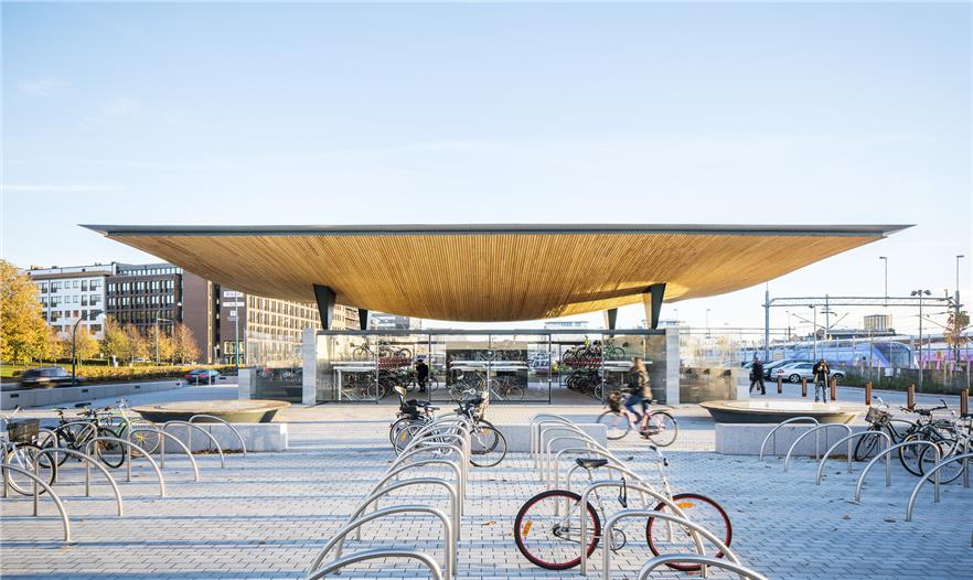 換言之,新的入口把一個匿名的后側(cè)變?yōu)榱肆硪粋€前側(cè)入口。這同樣有助于增加交通的安全性,因?yàn)椴叫械叫@不得不經(jīng)過巴士終點(diǎn)站,這在以前會被新的巴士線路所阻擋。新的人行道穿過了 J?rnv?gsgatan,聯(lián)通著 Bollebrogatan甚至是更直接通向當(dāng)?shù)氐腟tadsparken公園和南側(cè)的城市地區(qū)。更進(jìn)一步的目的是促進(jìn)城市的自行車交通。在入口臺階和開放平臺之間打造了總共450個自行車停車位。這里還有其他配套設(shè)施,比如打氣筒、維修站和儲物柜。