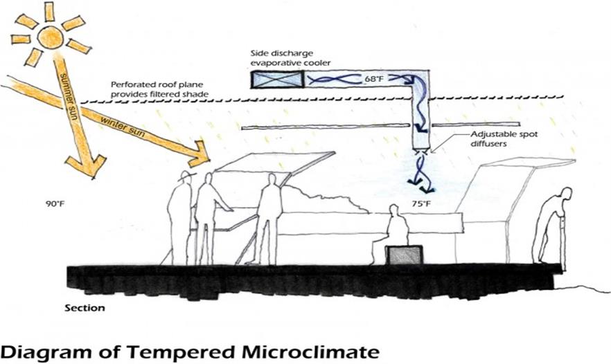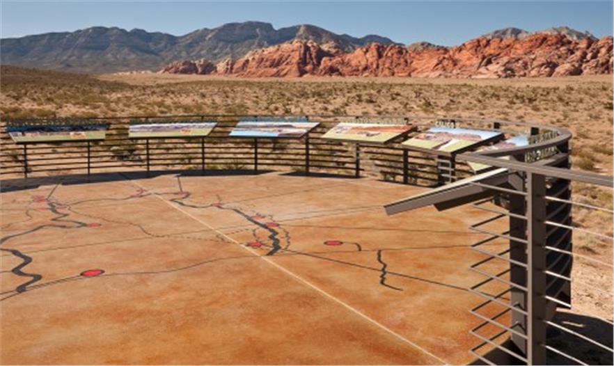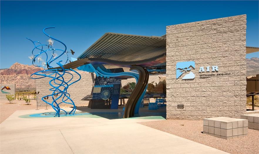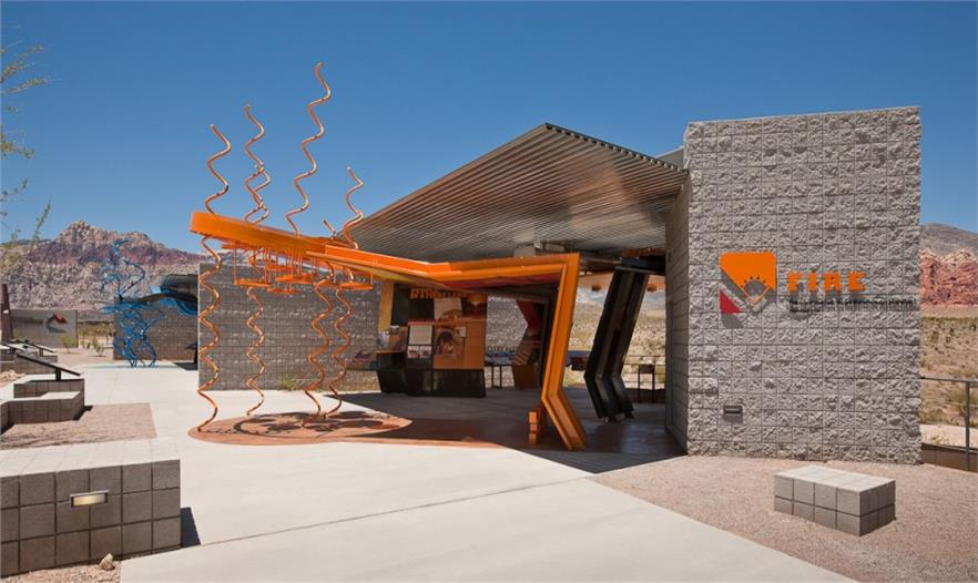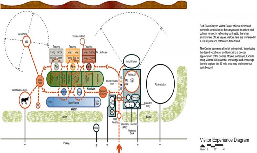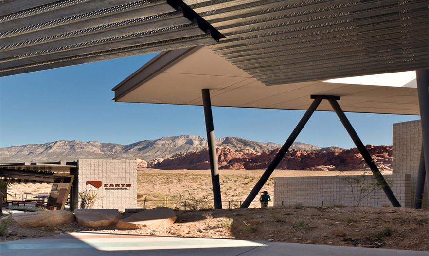 新設(shè)計(jì)為人們提供了戶外體驗(yàn)的空間,在這里人們可以親身感受保護(hù)土地的責(zé)任感。讓游客了解紅石峽谷的關(guān)鍵就是親身的體驗(yàn),使之成為沙漠景觀的一部分。新的游客中心旨在向每年1000,000位旅客介紹紅石峽谷的地貌,科學(xué),藝術(shù)和文化,并鼓勵(lì)他們親臨感受。該游客中心與傳統(tǒng)的不同在于其強(qiáng)調(diào)了紅石峽谷本身的特殊性,代替了實(shí)景模擬和對(duì)偽天然場(chǎng)景的模仿。在這里,游客可以看到展示周邊景觀的室外抽象雕塑展品,并為他們親身探索國(guó)家保護(hù)區(qū)做一定的準(zhǔn)備。這個(gè)革新的手法可以使游客脫離室內(nèi)環(huán)境,來(lái)到室外使用陰涼,蒸發(fā)冷卻和大功率節(jié)能風(fēng)扇等手段創(chuàng)造的舒適的微環(huán)境中。在夏天,這些措施使人在戶外展區(qū)感到?jīng)鏊?,體感溫度相比于在太陽(yáng)光下可下降10到15度。建筑師將展品從室內(nèi)空調(diào)環(huán)境移到溫和的室外微環(huán)境下,大幅減少了能源的利用同時(shí)為游客帶來(lái)了獨(dú)特真實(shí)的體驗(yàn)。