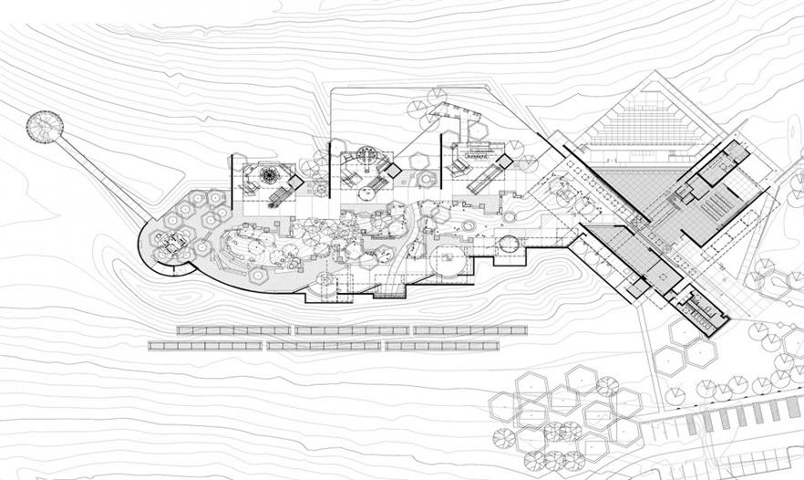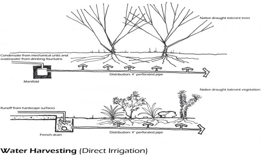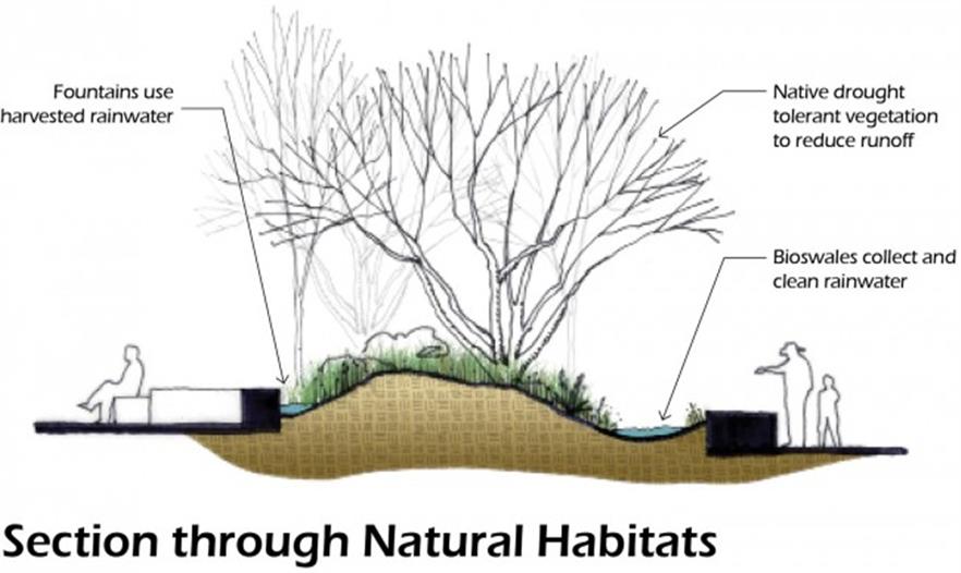 雨水收集系統(tǒng)的利用不僅可以保護(hù)能源,還可以作為講解設(shè)施的一部分。15,000加侖的雨水和雪融水儲(chǔ)存起來(lái)用于講解展示水的特性以及灌溉沙漠。滴管噴泉沿著入口大廳設(shè)置,用于給游客展示沙漠中最重要的資源-水。水滴入一個(gè)小的鋼盆中,溢出到一個(gè)種植著Mojave地區(qū)半滋潤(rùn)性的天然植物來(lái)表面降雨對(duì)這些植物的不可或缺。
