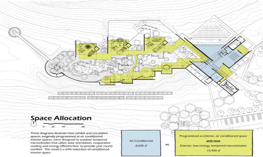 新設(shè)計(jì)內(nèi)結(jié)合了眾多節(jié)約能源的想法。一到達(dá)建筑,一個(gè)“大帽子”形的懸垂屋頂遮擋創(chuàng)造了一片熱過(guò)渡區(qū)域,并形成了可以收集雨水的平面,收集來(lái)的雨水用于灌溉沙漠和講解展品。這些熱過(guò)渡區(qū)域提供了一個(gè)空間,用于減輕使用者從炎熱、明亮的室外步入涼爽較暗的室內(nèi)所帶來(lái)的不適感。這個(gè)懸垂屋頂也在夏天為整面的玻璃提供了遮擋,在冬天低矮的日光也可以照射進(jìn)這個(gè)空間,減少度建筑機(jī)械系統(tǒng)的需求。建筑使用了高效率的機(jī)械系統(tǒng);太陽(yáng)能熱水器,滲透型太陽(yáng)能集熱系統(tǒng)和55千瓦的光伏陣列將此地強(qiáng)烈的日光照射轉(zhuǎn)換成自由能。滲透性太能能收集系統(tǒng)為衛(wèi)生間提供暖氣和熱水,免去了機(jī)械系統(tǒng)的需求?;炷疗鲶w,鋼和玻璃等自然持久材料的運(yùn)用減少了維護(hù)的需求,并使建筑更好的與景觀融為一體。作為未來(lái)基礎(chǔ)設(shè)施升級(jí)的一部分,新的再循環(huán)廢水系統(tǒng)將會(huì)替代現(xiàn)有的化糞池系統(tǒng),在衛(wèi)生間反復(fù)利用再生水沖廁。