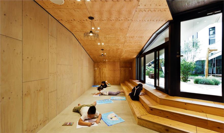 室內(nèi),幼兒園的一些區(qū)域故意沒有裝飾,地面、墻壁和天花板上覆蓋著未完工的夾板,給孩子們提供能夠考慮問題的地方。額外的游客設(shè)施如隱藏的梯子和墻角的秋千都仔細(xì)地安排在幼兒園的室內(nèi)空間,模糊學(xué)習(xí)和休閑之間的界限,這樣孩子們就不會產(chǎn)生抗拒心理。