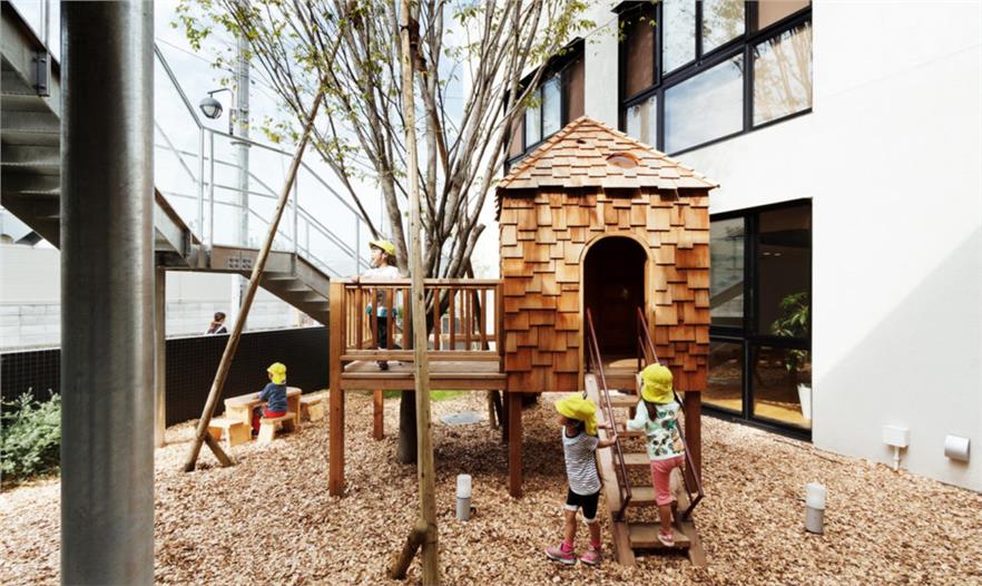 該幼兒園最好的一方面是其蔓生的綠色庭院,設(shè)有傾斜的山坡和游樂設(shè)施,孩子們能在新鮮的空氣中跑步、攀爬。這個游樂區(qū)與草地覆蓋的斜坡連接起來,通向上層戶外平臺,那里樂趣更多。該庭院一個獨立區(qū)域的特色是攀爬結(jié)構(gòu)和一個有趣的木制玩具房,激發(fā)想象力,放飛思想。