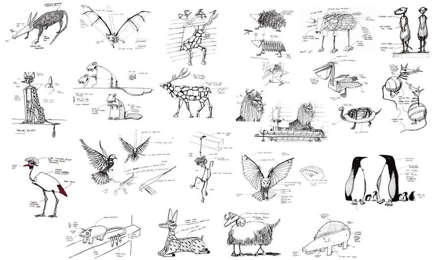 該事務(wù)所團隊與制作者合作設(shè)計和建造了186對手工制作的動物。許多動物都是回收瓶蓋、自行車部分、棒球手套、槌球、拖把頭和后視鏡等,將它們重新改造進行設(shè)計的。