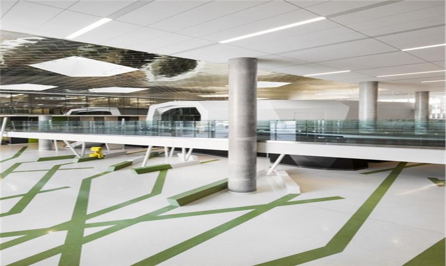 基地靠近Mount Royal保護區(qū),這促使建筑師去創(chuàng)造一個健康的環(huán)境?;凇俺匀弧钡母拍?,該項目使用的顏色和元素受啟發(fā)于北方森林的動物和植物,并創(chuàng)造了允許自然光滲透的空間,供散步的公共區(qū)域和連接新、舊建筑的綠色小路。由樹根,樹皮,樹枝,葉子和動物組成的標志性小景觀使來訪者關(guān)注建筑中庭和公共空間。建筑的主立面上的圖案如同許多樹干,營造出節(jié)奏感 和連續(xù)性。在中庭,兩個堆疊的卷,如同一個矩陣生成周圍的空間,容納兩個禮堂,并提供了觀賞戶外花園的絕佳視野。無論是通過樹枝帶還是小徑,都使用了Mount Royal植物園的植物和動物的形象,為患者以及他們的家人和護理者創(chuàng)造了一個治愈性的環(huán)境。