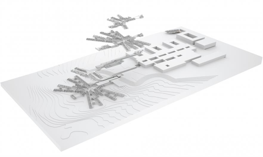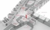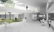 新精神病院是由7部分組成,位于主建筑脊梁上2個放射結(jié)構(gòu)分支上。這個脊梁的出發(fā)點是其主要入口,供新舊身體研究醫(yī)院共用。這個脊梁用于連接3個通訊區(qū)以及進(jìn)入這7個新部分的入口。接下來就是接待室、診所、自助餐廳、接待室、活動室、診療室、禮堂和教學(xué)設(shè)施,還能夠進(jìn)入溫室和花園。頂點是運動中心,帶有屋頂露臺,能觀賞到鄉(xiāng)村景色。