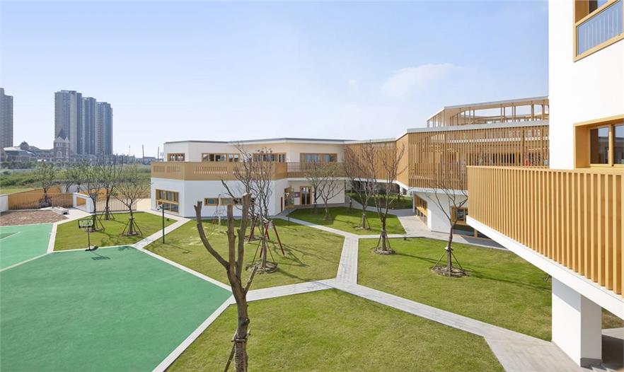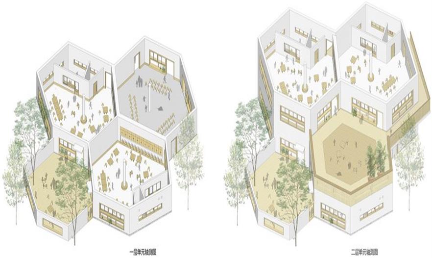 教室內的集中活動圍繞中心的圓柱展開,臨近外墻則有專門為孩子設計的凸窗空間,是他們閱讀和照料小植物的場所。每一層每一間的教室都與室外的分班活動場地直接相連,兩個班級分享一個活動庭院。從自己的庭院開始,孩子們可以出發(fā)去圖書室、音樂室、美術室、游戲室、食堂、多功能廳、小小農場以及其它班級的庭院和教室,室外樓梯使二樓和三樓的孩子能夠便捷地從自己的庭院加入到一樓大操場的活動中。