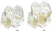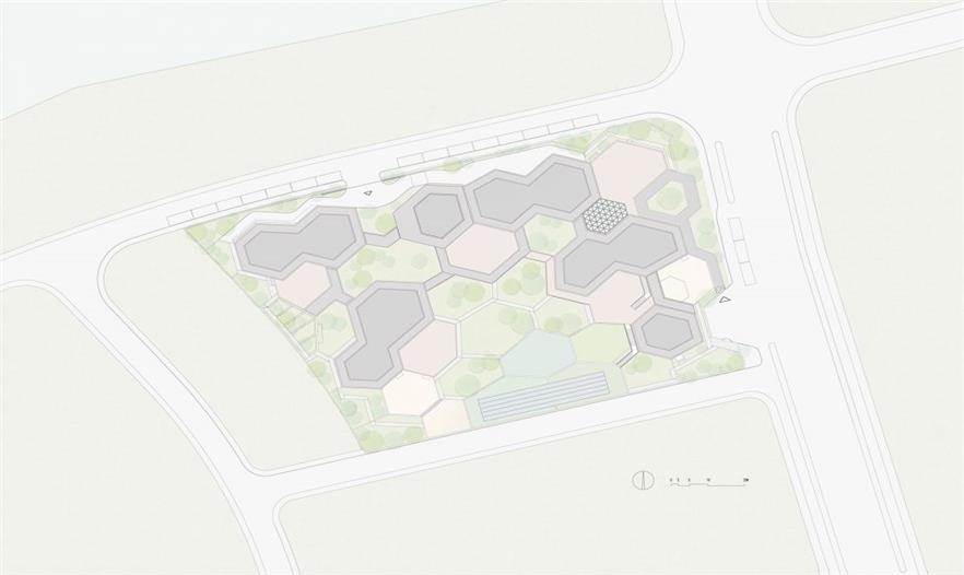 庭院的營造需要建筑單元的圍合,建筑師順應場地西側的斜向邊界,將建筑群的平面布局規(guī)劃成“W”形,加上自南向北的退臺,最大限度地獲得西、南、東三個方向的日光。經過研究,建筑師發(fā)現六邊形單元體是適應這一群體形態(tài)的最佳選擇,蜂巢狀的組合能夠更好地適應斜邊的轉折,其內部和外部空間更有活力和凝聚感,也能夠消解傳統(tǒng)四合院中正交軸線所產生的壓力。最終形成的單元體是不規(guī)則的六邊形,其中三個邊等長,這使設計能夠根據日照和功能的需要進行更加靈活的組合。