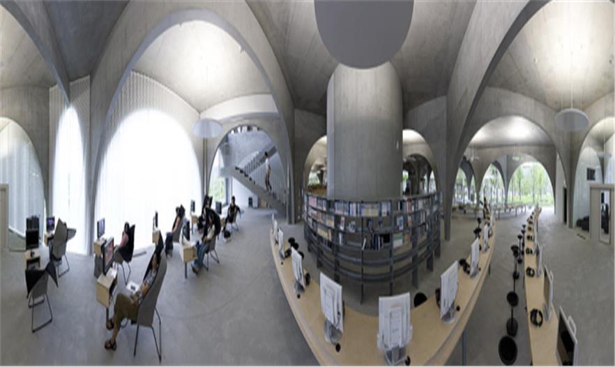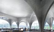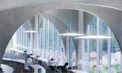 第一個點子就是底層開闊的長廊式空間,為人們穿越校園提供一條活動道路,即使他們目的不是為了走進圖書館的。為了讓人們的流動和視覺自由地貫穿建筑,他們開始考慮使用隨機排布的拱形結(jié)構(gòu)來營造一種感覺,讓傾斜的地面和外面的公園風(fēng)景和建筑保持連續(xù)。