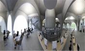 從樓梯走向第二層,裝有大本藝術(shù)書籍的矮書柜穿插在拱形之間,在書柜之間是不同大小的學(xué)習(xí)桌和擺有復(fù)印機的大桌子。人們穿梭在這些拱形之間會體驗到不用的空間感受間的變化,從充滿自然光線的修道院到視覺上不可洞穿的地下隧道。