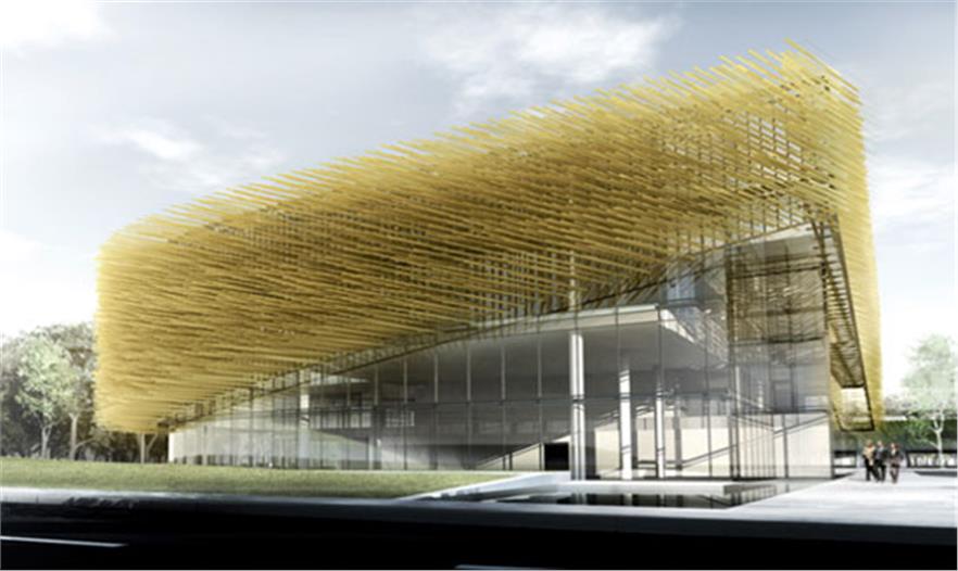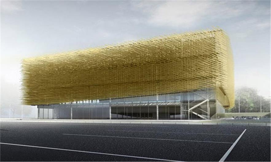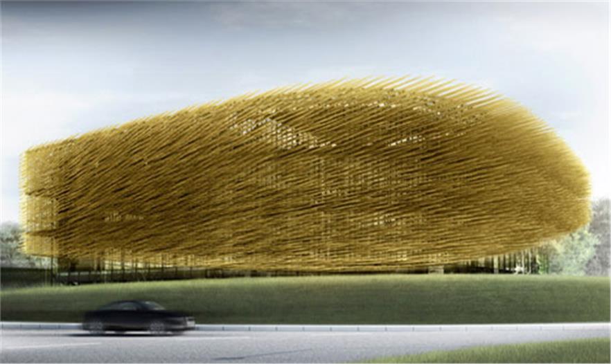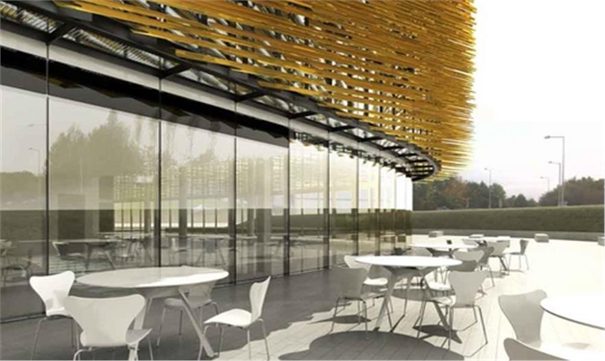 該建筑以其獨特的建筑立面聞名于世,建筑主體以玻璃圍護,而在其頂部是一系列朝向同一方向的金黃色蘆葦狀鋁翅片,開放商和建筑師都希望該大樓能成為當?shù)貥酥拘越ㄖ?/p>
