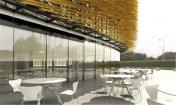 這一獨特的造型,可以根據(jù)觀察者視角的變化,產(chǎn)生多種視覺效果。在建筑的側(cè)面看,建筑是運動的,而在建筑前面看,則會看到鋁翅片如點分布在玻璃上。這些鋁翅片毫無疑問是建筑師出于美學方面的考慮而作出的選擇,但它們也會起到遮陽擋雨的作用。