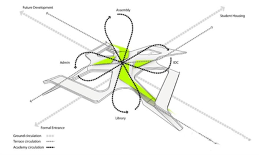 新加坡科技設(shè)計(jì)大學(xué)是新加坡第四所提供四項(xiàng)重要學(xué)科教育的大學(xué),包括建筑和可持續(xù)性設(shè)計(jì)、工程產(chǎn)品開發(fā)、工程系統(tǒng)和設(shè)計(jì)、信息系統(tǒng)技術(shù)和設(shè)計(jì)。校園主要沿兩條主軸布局,生活區(qū)和學(xué)習(xí)區(qū)重疊形成中心點(diǎn),學(xué)校其他部分則圍繞這個(gè)中心連接在一起。