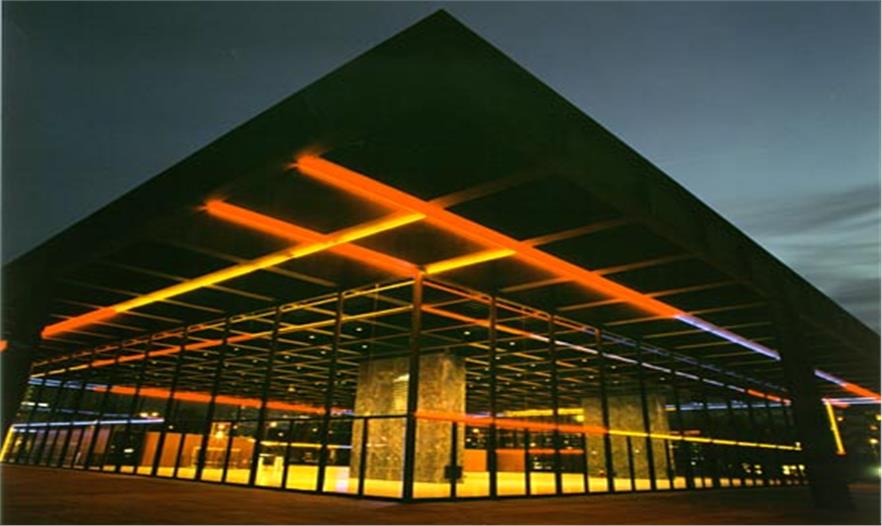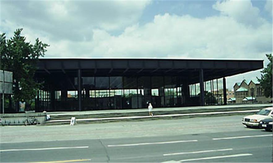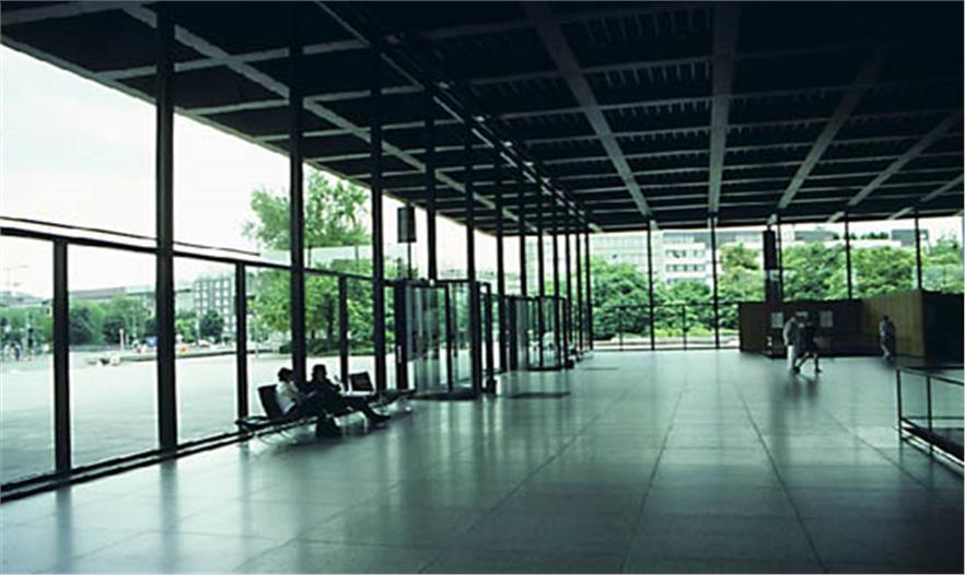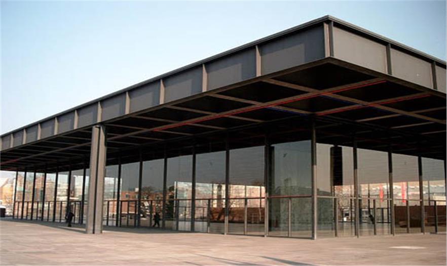 密斯的名聲,從1929年設(shè)計(jì)巴塞羅納國(guó)際博覽會(huì)德國(guó)館開始,走過(guò)40年的人生,為他的祖國(guó)設(shè)計(jì)的新國(guó)家美術(shù)館,標(biāo)志著人生最后乃至最高的到達(dá)。和巴塞羅納的德國(guó)館相比,晚年的設(shè)計(jì)已經(jīng)是在單純的造型中尋找到歸宿,他為新國(guó)家美術(shù)館設(shè)計(jì)的是一個(gè)幾乎不需要進(jìn)行任何切割的巨大正方。