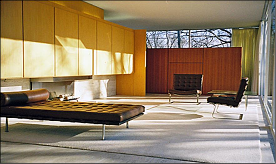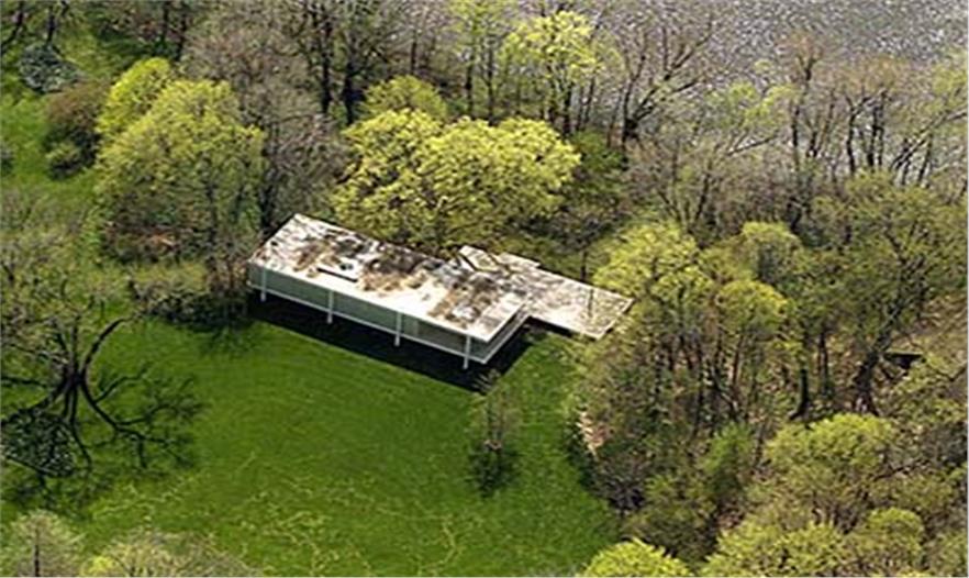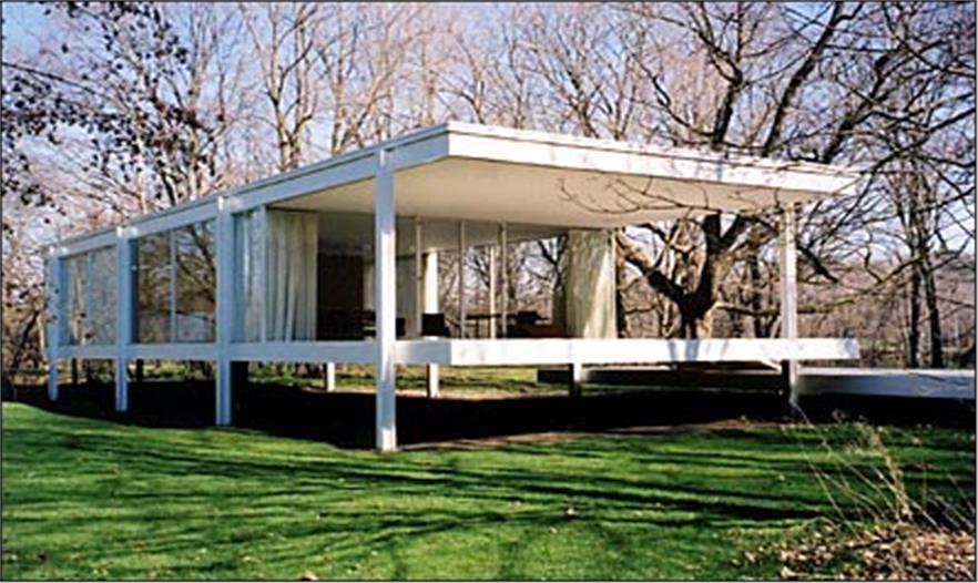 范斯沃斯住宅:(1945-1950)一個架空的四邊透明的玻璃盒子,象水晶一般純凈。[