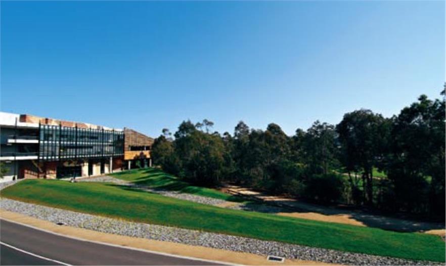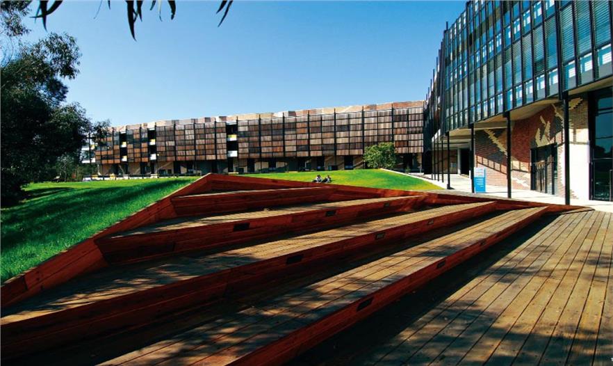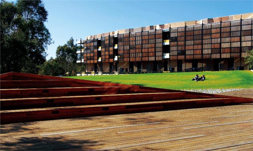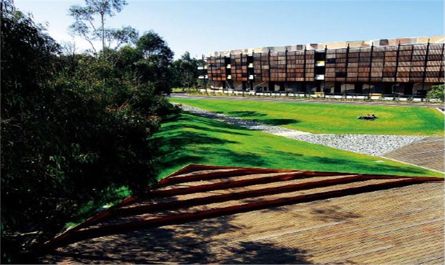迪金大學(xué)中心區(qū)景觀是B u r w o o d 校區(qū)新設(shè)施的一部分, 包括設(shè)計(jì)校園廣場, 廣場周圍是四座由H 2 O 建筑師事務(wù)所設(shè)計(jì)的新大樓, 自然地將Gardiners小溪與未來的開發(fā)場地連接起來。平臺(tái)位于大樓的北面與草坪相連,營造出大片沼澤地,考慮到校園的地形,以前的“方形草坪”通過設(shè)置階梯成為“菱狀草坪”。在小丘上種植植被和蕨類樹木,將校園與新橋連接起來。沼澤地分布在草坪中,在雨水未流進(jìn)溪流之前,對(duì)其進(jìn)行收集、儲(chǔ)存和管理。設(shè)計(jì)的對(duì)環(huán)境反映敏感的雨水處理系統(tǒng),正是該項(xiàng)目所追求的目標(biāo)。其他方法包括:灌溉、本土化植物的種植、以及提供更好的公共交通系統(tǒng)。迪金大學(xué)中心區(qū)選材精心,加強(qiáng)了與正面大樓之間的聯(lián)系,并且通過這樣的方式,形成當(dāng)代大學(xué)校園的新風(fēng)貌。