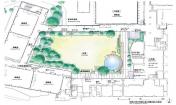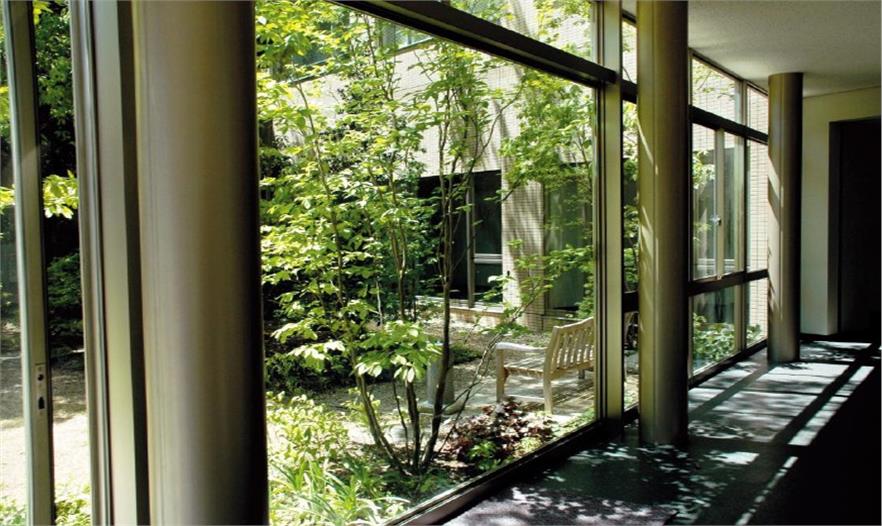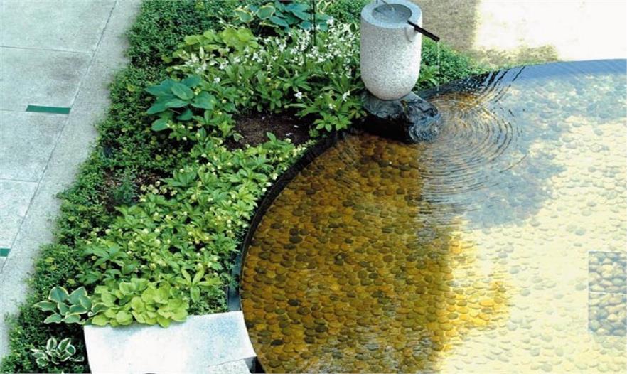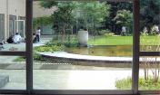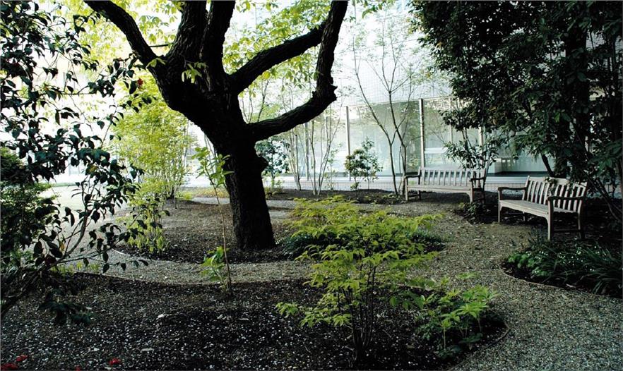 圓形的人造水池被安置在禮堂出入口的前方,水池四周被薄薄的黃銅片包圍著,起到加固的作用。平靜的湖面仿佛明鏡般倒映出四周綠樹的影像和天空中變幻的藍(lán)天白云,使得庭院呈現(xiàn)出豐富多彩的景色。典型的日式水盆被安置在水池的旁邊,為這座現(xiàn)代庭院增添了本土特色。從水盆流出的涓涓細(xì)流落在池面上,激蕩出的層層水聲更襯托出了庭院的寧?kù)o。在庭院的東邊,新修葺的小樹林將已有的高大樹木環(huán)抱著,艷麗的開(kāi)花植物和色彩柔和的草本類植物也被選種于此,混搭的植物群展現(xiàn)出充滿生機(jī)的自然美景,同時(shí)也將“花”的主題體現(xiàn)得淋漓盡致。