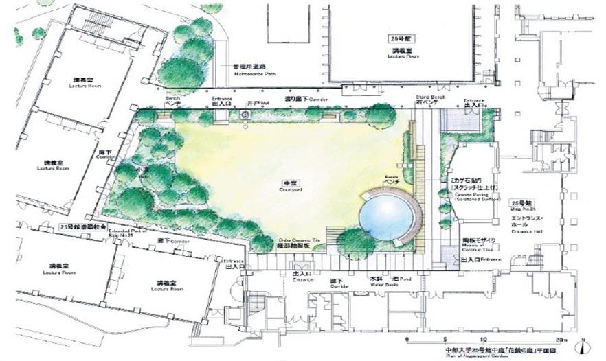 鏡花園位于日本中部大學(xué)25館延伸地帶的中庭,花園的名字靈感來(lái)源于Z e a m i 的作品《H a n a k a g a m i 》。在日文里“ H a n a ” 和“ K a g a m i ” 分別表示花和鏡子的意思,所以庭院的設(shè)計(jì)也以“花”和“形似鏡面的水池”為主題。