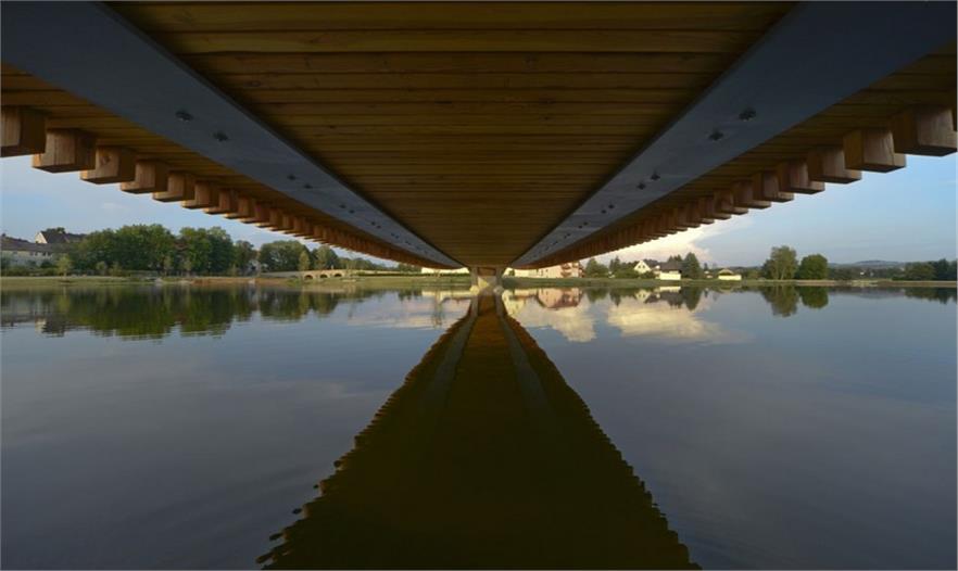 這座位于蒂申羅伊特德跨河拉伸張力大橋是由ANNABAU建筑事務所和Schüßler-Plan工程公司共同完成的作品。概念源起于兩個團隊在2013年Landesgartenschau Tirschenreuth花園節(jié)上的作品,如今兩個團隊將其延伸發(fā)展成現(xiàn)在的大橋。這座人行橋總長度為85米,橫跨河上。大橋將蒂申羅伊特老城區(qū)市中心與對岸的休閑娛樂廣場聯(lián)系起來。木結構的橋身充分體現(xiàn)了當地以木材文明的悠久歷史,彰顯出鄉(xiāng)土建筑的傳統(tǒng)魅力所在。木橋之上的鋼筋拉伸支撐結構采用了最小化的結構設計,從而使整個橋的外觀與水面和周圍自然環(huán)境更加相容,完全沒有突兀的感覺。