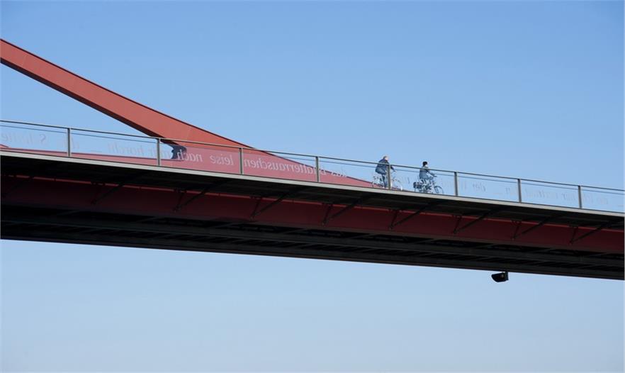 這座橋分兩期建設(shè)。首先,橋的放置平行于現(xiàn)有的橋,并作為一個用于大約18個月的臨時通道。第二階段被拆除現(xiàn)有的結(jié)構(gòu)和橋橫,代替以前的結(jié)構(gòu)。該里姆斯特橋梁支座是一個龐大的建筑,包括一個博物館和橋梁壩肩結(jié)構(gòu)。該建筑分布在橋底下,并構(gòu)成一個視覺上和時間上的連接。博物館內(nèi)設(shè)有各種多功能空間:咖啡廳、餐廳和一個圓形劇場,可以進行文化活動。建筑物外墻170米長,由預(yù)制混凝土制成,以便用作爬墻。這棟樓的重點是第二次世界大戰(zhàn)的信息中心。展覽中心以藝術(shù)的方式、融合多媒體元素對歷史故事進行再現(xiàn)。原來的掩體新大樓保持了70年前發(fā)生在德國入侵的原貌。