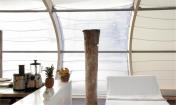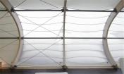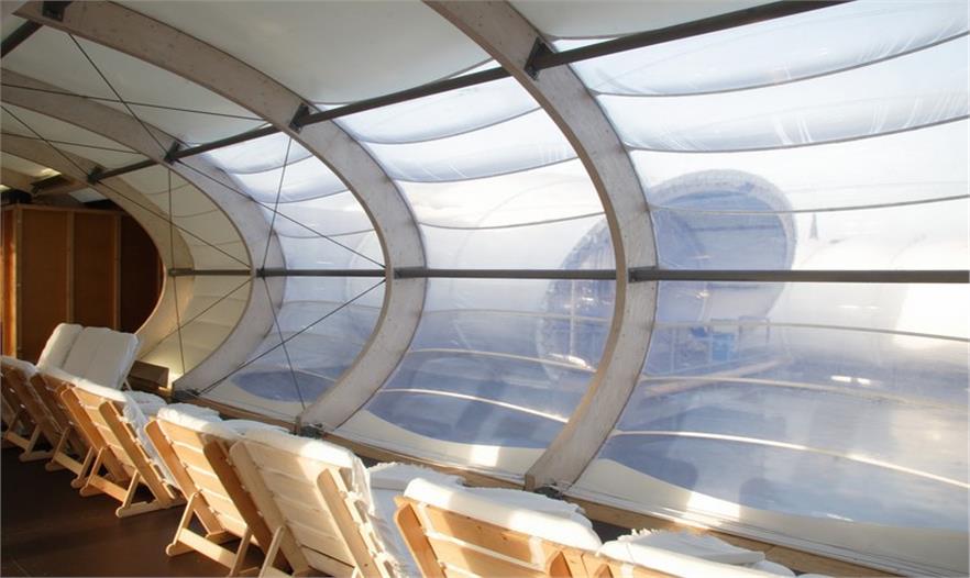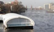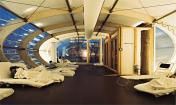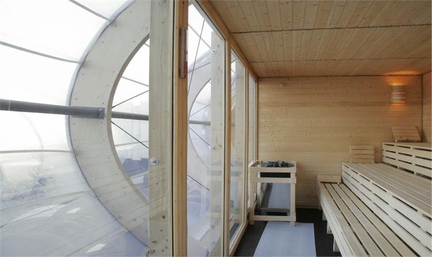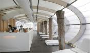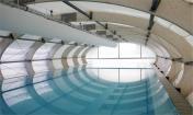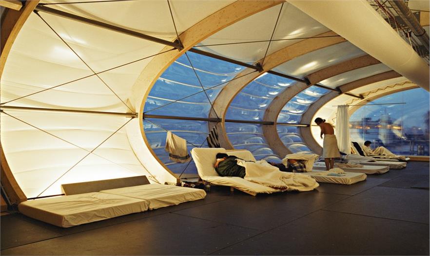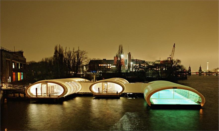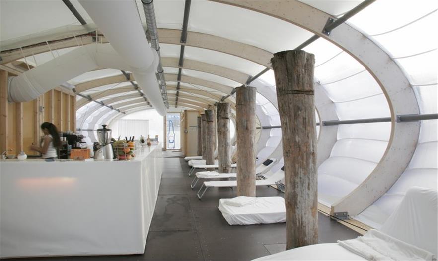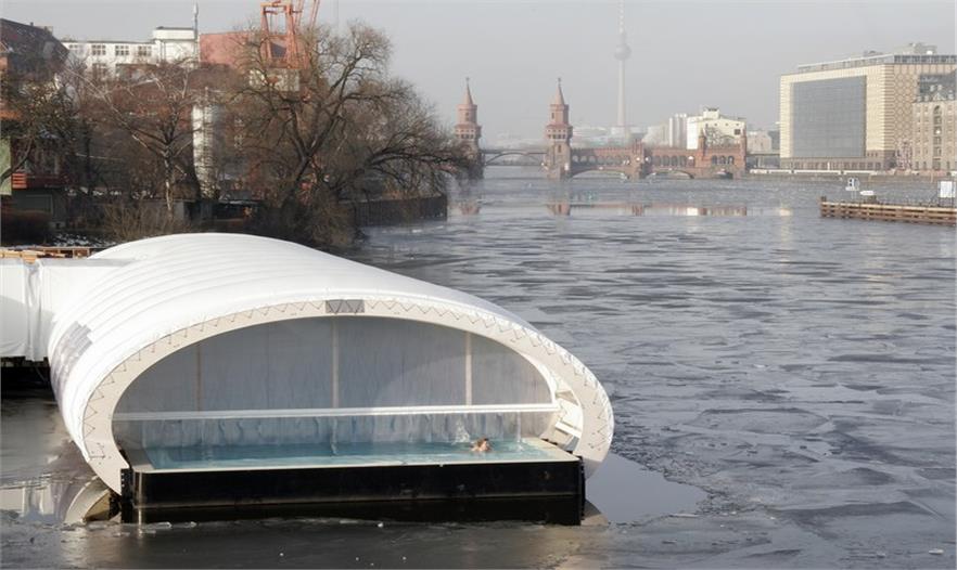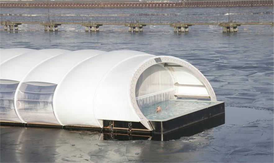 德國柏林的“Badeschiff”游泳船由以前的一個集裝箱改造而成,漂浮在施普雷河上,再加上由原集裝箱碼頭改造而成的人工沙灘和后面廢舊倉庫改造成的商業(yè)市場,構(gòu)成了一道只有柏林才有的風景線。這些橢圓形泳池內(nèi)部由木質(zhì)桁架支撐,而拱頂則通過雙層的白色氣膜搭建,兩層膜之間充滿了空氣從而確保不論屋外是嚴寒或是酷暑,屋內(nèi)都能保證25℃的恒溫。為了盡可能降低成本,整個建造采用低復(fù)雜性的設(shè)計方案同時使用完全統(tǒng)一的標準化材料和設(shè)計流程。為了確保每一個組裝部件的快速安裝及使用,整個泳池內(nèi)部均采用了可以簡單裝卸的部件安裝。這些可拆卸的部件可以在夏季時重新運回岸上另作他用。在這里人們不僅可以邊觀賞沿岸美景邊游泳,同時也可以享受到桑拿浴,所有這些活動都為寒冷而倦怠的冬季增添了一絲暖意和樂趣。