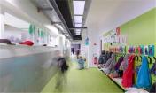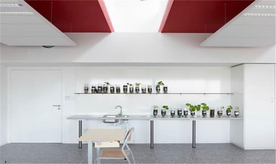 穿過屋頂?shù)臉淠?,在空間上連接校園的活動場。不連續(xù)的木材的建筑表皮有點像彩色鉛筆,它可以防止窗戶被過度日曬,并給運動場遮陽。