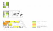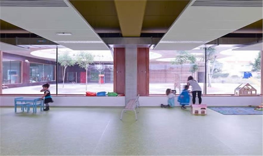 該小巧的教育綜合體包括:覆蓋整個基地的保育園。很大空洞的屋頂。小學,細長的體量,屋頂是活動場。