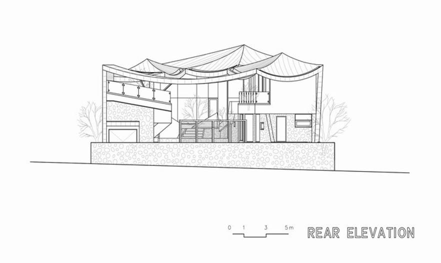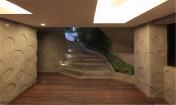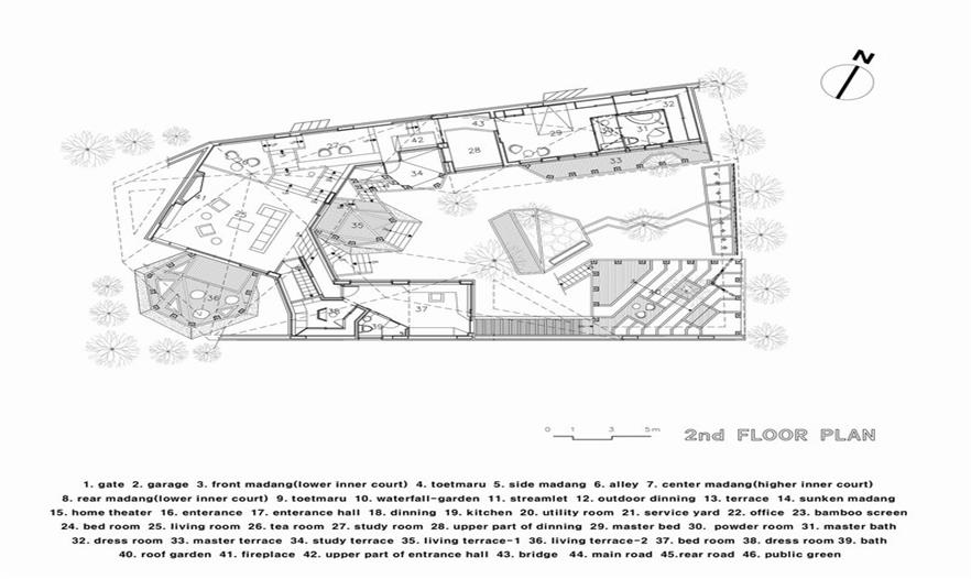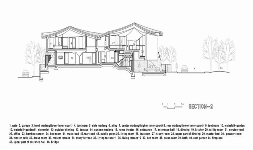 大約20年前,政府在GangNam舉辦了“房博會(huì)”,并且建造了許多低層住宅,挑選韓國(guó)當(dāng)時(shí)著名的建筑師進(jìn)行設(shè)計(jì)?;?ldquo;GaOnJai”就是其中之一,業(yè)主在舊房拆了之后不久,建造了這所新宅。業(yè)主希望能夠最大化土地的利用率,并且希望住宅是生態(tài)的;其次是內(nèi)向性的空間,以便保護(hù)隱私;最后業(yè)主希望能夠引入周圍山體的景色,以便臥室能有個(gè)非常好的視角。住宅本身要具有韓國(guó)文化的印記,建筑師認(rèn)為這片基地是韓國(guó)居住區(qū)規(guī)劃中最令人滿意的。將傳統(tǒng)語(yǔ)言“Madang”,“Ru”,“Cheoma”,“Doldam”流傳下去。引入“Madang”內(nèi)院的概念,建筑師已解決了內(nèi)向性空間以及生態(tài)環(huán)境的設(shè)計(jì),將室外空間的使用率提高,營(yíng)造一個(gè)健康、自然的生存環(huán)境。引入“Ru”底層架空韓式建筑,建筑師吸取了山體周圍環(huán)境的多樣性和獨(dú)特性,將臥室通過軸線引入到山體景觀中,架空層是住宅多樣性序列空間的開始,就像是一個(gè)地窖。引入“Cheoma”懸臂屋頂,建筑師將傳統(tǒng)建筑語(yǔ)言轉(zhuǎn)換為現(xiàn)代建筑語(yǔ)言。通過橢圓形的圖案來裝飾墻面,這源自于傳統(tǒng)的石墻。通過適應(yīng)現(xiàn)有基地的地形,從低“Madang”到高“Madang”,建筑師設(shè)計(jì)的不同階梯型室內(nèi)空間,營(yíng)造了一種趣味性。這種對(duì)于自然的運(yùn)用方式成為了韓國(guó)建筑文化的基本特征。住宅室內(nèi)外通過一個(gè)回旋式的路徑,來創(chuàng)造一個(gè)多樣且有趣味的空間。建筑師希望業(yè)主的生活能夠通過這個(gè)回旋式的空間而變得更有趣。