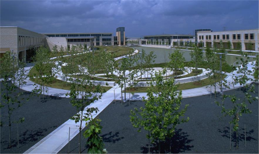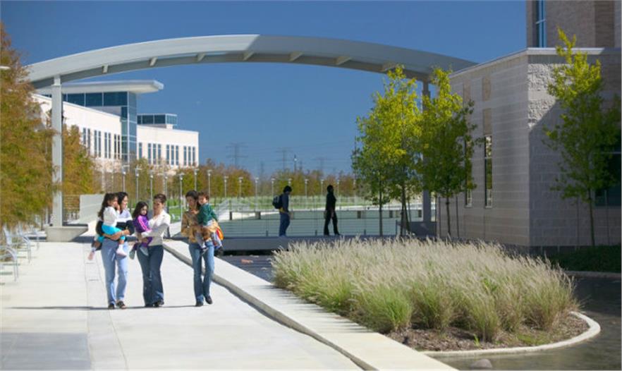 CyFair學院位于休斯頓西北部的郊區(qū),靠近一塊瀕臨滅絕的濕地,其校園設(shè)計是環(huán)保與生態(tài)保護性設(shè)計改造的典范。SWA集團與其他建筑師一起采用積極的方案對這塊濕地進行了改造。其藝術(shù)性的設(shè)計以環(huán)保為基本理念,通過整體設(shè)計與建設(shè)工程將CyFair學院改造成一個美麗的生態(tài)社區(qū)校園。