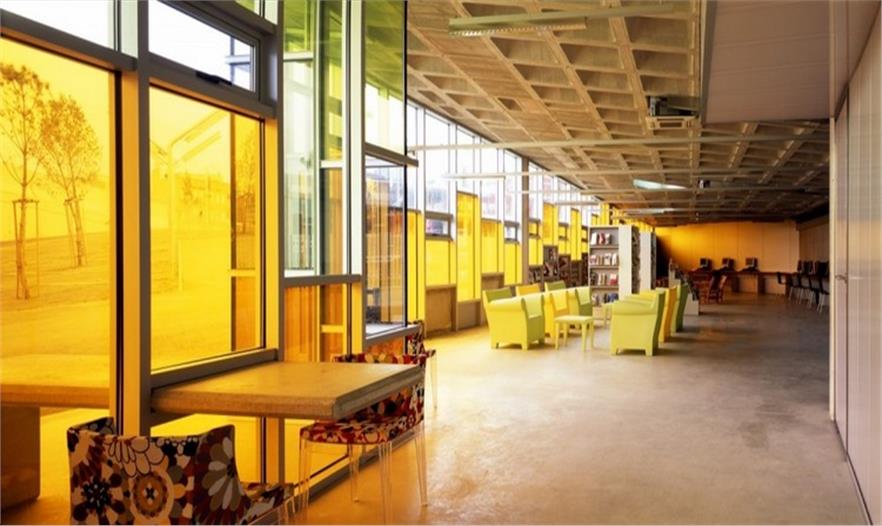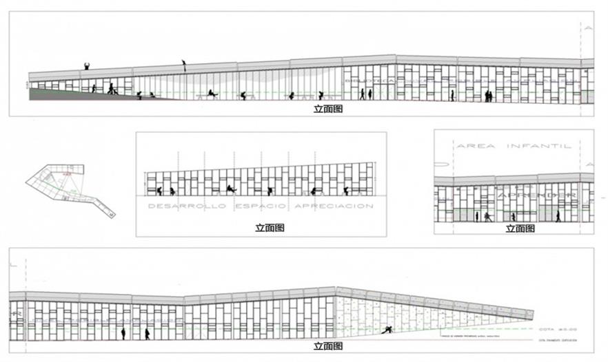 U型圖書館中間區(qū)域是一處多功能綠色空間,包含滑板區(qū)、自行車公園、秋千、球場、溫室等。圖書館外圍毗鄰一個學校,有很多體育設施,同時它的建造提升了該區(qū)域景觀共融性和利用率。隨著項目及其附屬建筑的完工,藝術畫廊也最終呈現(xiàn)出來——由獨立通道進入,人們可以在這里俯瞰此區(qū)域的全景。