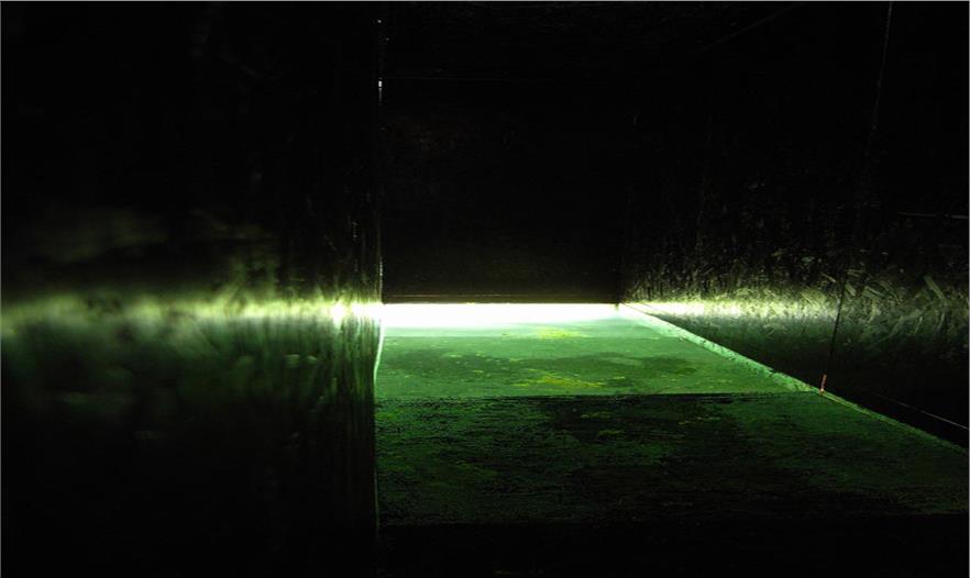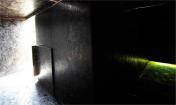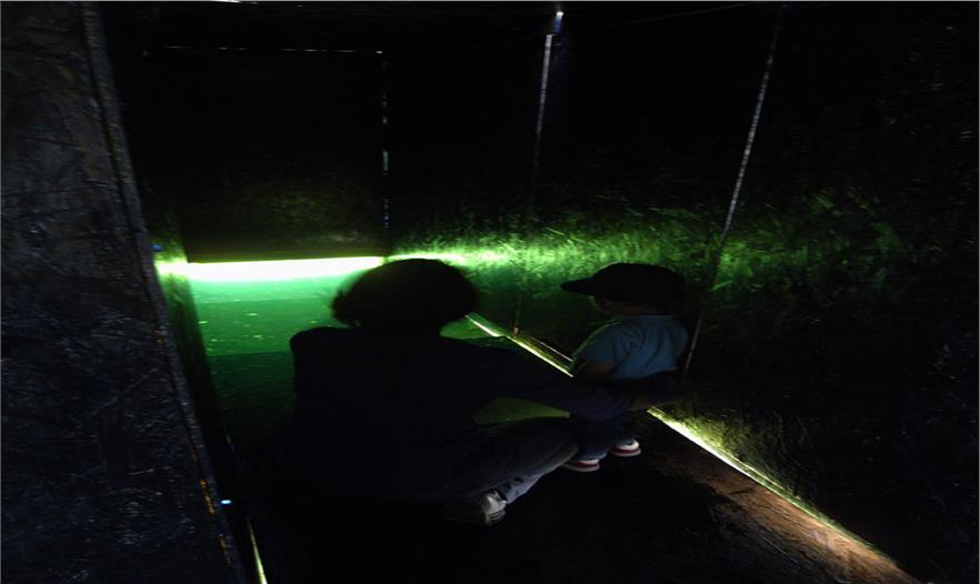 在木板隔墻和地面之間留有一道狹窄的縫隙,綠色的光線會(huì)透過縫隙微微照亮這個(gè)黑暗的空間。陽(yáng)光在的湖面上反射出光線,并滲透到這個(gè)全黑的方盒子內(nèi)部。迷失在其中的參觀者只能依靠最基本的感受來活動(dòng),并對(duì)我們身邊的世界有了更深層次的體驗(yàn)。