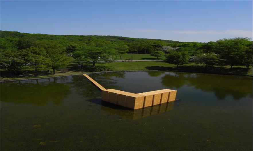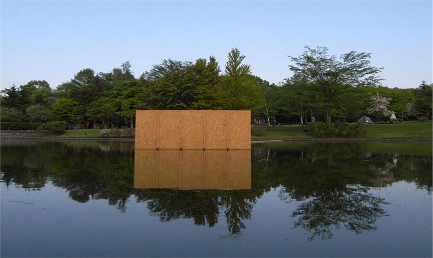 由日本建筑師山田良(ryo yamada)設(shè)計(jì)的“無限景觀”裝置位于日本札幌當(dāng)代藝術(shù)博物館的中心湖面上。參觀者必須要通過一條細(xì)長(zhǎng)的小木橋才能從陸地到達(dá)湖中心的建筑裝置中。這個(gè)方盒子被OSB導(dǎo)向展板包圍。一旦進(jìn)入封閉的盒子中,墻壁和屋頂都是黑的,一絲光線都無法進(jìn)入,同時(shí)這個(gè)全黑的環(huán)境還讓參觀者喪失了方向感和時(shí)間感。