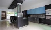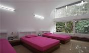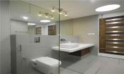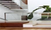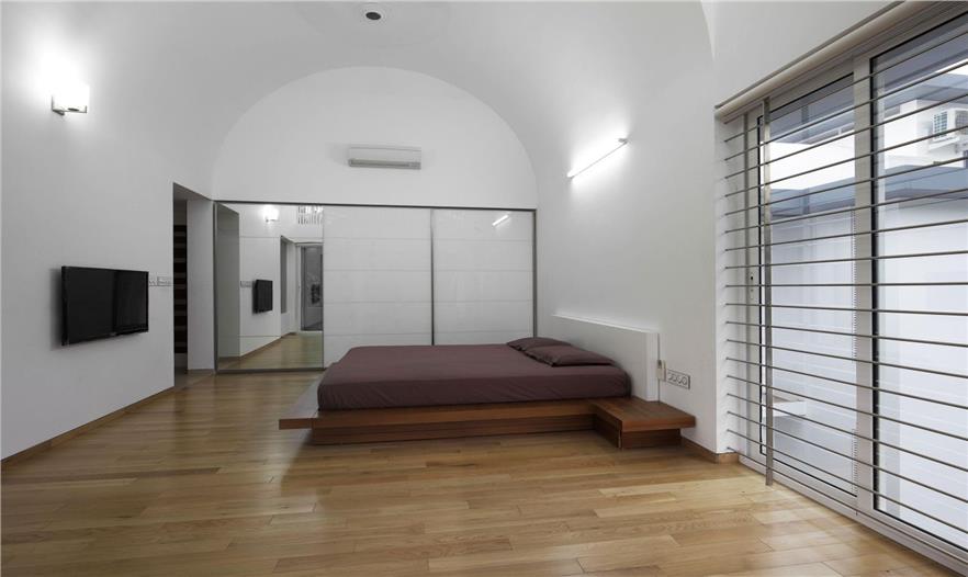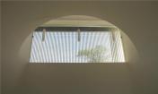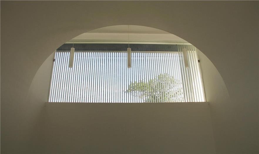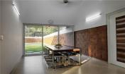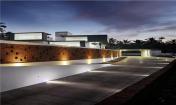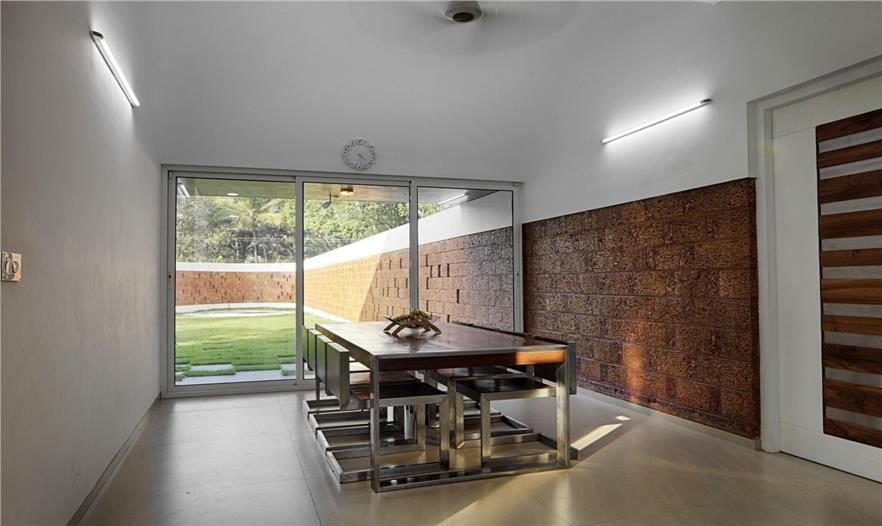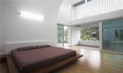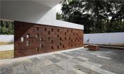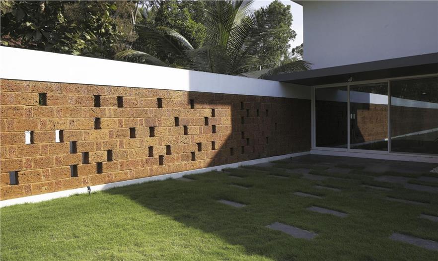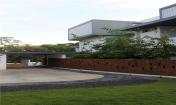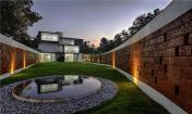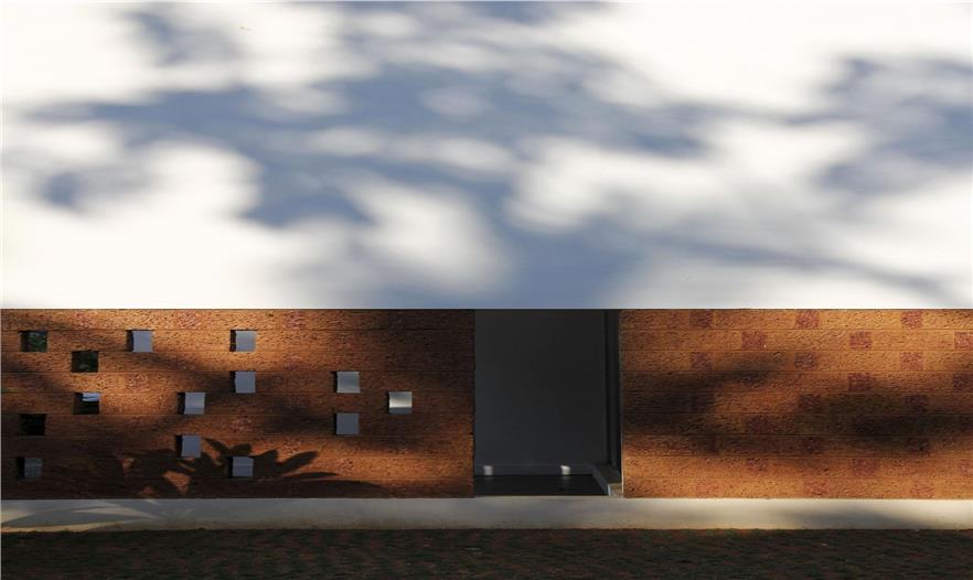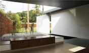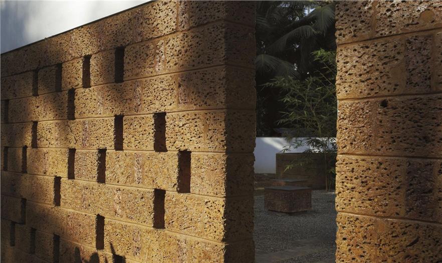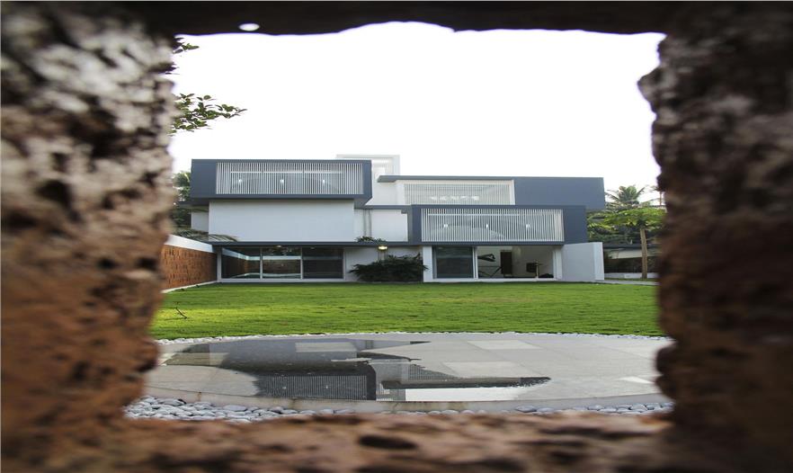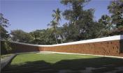 業(yè)主的要求很簡單也很少,“一個不能攀爬的像家一樣的堡壘”。由于場地正好位于喀拉拉邦最為擁擠的社區(qū)之一中央,業(yè)主要求房子要看起來嚇人一點(diǎn)。事實(shí)上,好像有什么人站在外面,試圖進(jìn)入房子。石膏墻與裸磚墻的混合形式。磚石,一度在喀拉拉邦建筑中十分普及,擁有直觀的外觀并與周圍有聯(lián)系,因?yàn)樗蟮厣岛唾|(zhì)感。用一種新的語言來使用這種熟悉的石頭,不丟掉它們原始的形態(tài),會讓設(shè)計立刻落地,同時,因?yàn)楸憩F(xiàn)形式的改變,以巨大的縫隙來橋接現(xiàn)代建筑時代的到來。裸磚墻從混合墻開始與風(fēng)一起穿過景觀庭院進(jìn)入建筑。不僅是一堵墻或是籬笆,更像是一個流動的雕塑。巨大墻體的單調(diào)打破了石膏墻隨機(jī)的多樣性。石膏墻采購自兩個不同的礦場,因此墻體呈現(xiàn)有兩個顏色。在裸磚墻之間的垂直連接縫填充了白色水泥和磚石粉末的糊,因此強(qiáng)調(diào)了水平線。持續(xù)的水平線給予墻更多的流動性。長長的車道引導(dǎo)人們坐在戶外。在這,人們拾階而上到一個清晰的玻璃橋,跨過一個小瀑布,水從室內(nèi)游泳池流出。打開大門,路仍然以玻璃鋪就,腳下就是湍流的小溪。在這里是起居室和餐廳的路口,兩個房間都擁有巨大的景觀窗,為流動的混合墻體包圍。餐廳有一個長泳池,有回廊引向臥式。廚房就在餐廳前面的位子。廚房朝向另一片景觀開口,有一個羽毛球場地。3層高的室內(nèi)庭院內(nèi)有橡膠樹,蕨類植物和許多熱帶植物,以及一部樓梯通往地下家庭影院和上面的學(xué)習(xí)室。上面的走廊與屋頂一起提供了多變的天際線。多數(shù)房間與屋頂層數(shù)都有個小把戲。拱頂和平頂?shù)幕旌吓c通風(fēng)孔一起散熱。這種混合帶來房間與傳統(tǒng)之間的差異。場地的每一個細(xì)節(jié)都在設(shè)計之中被考慮到,結(jié)果是,很溫暖人心的知道每個成員都在房子的不同層和區(qū)域找到了新的功能和意義。