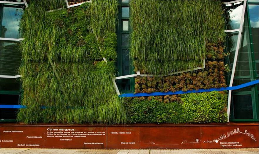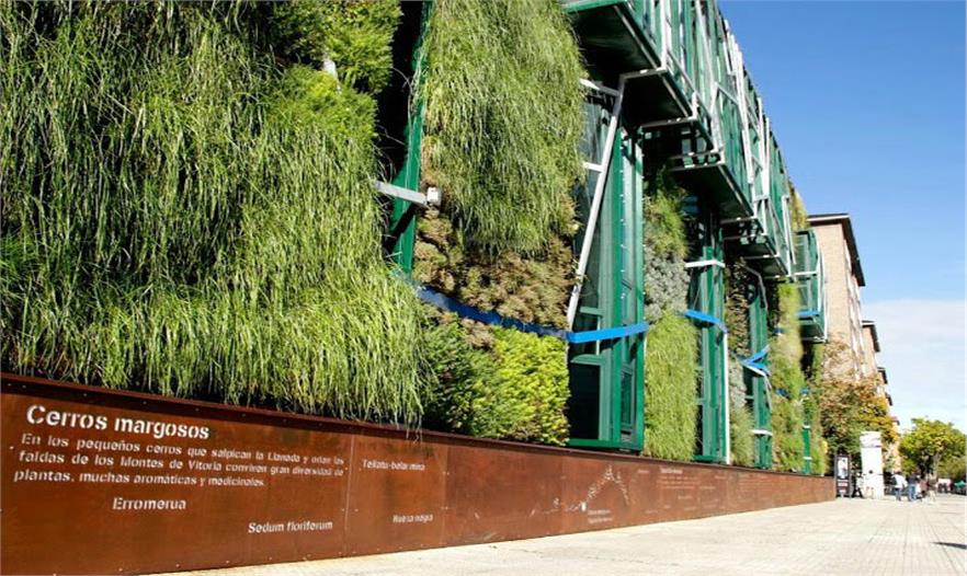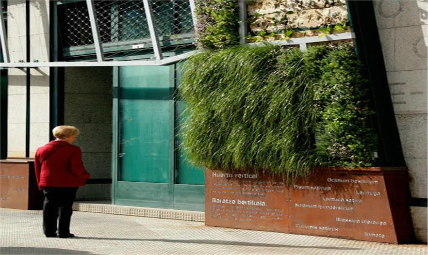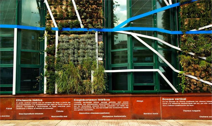 植物的設計也遵循了周圍的生態(tài)系統(tǒng)的規(guī)律。從左到右的外觀分別應用了Salburua濕地植被、阿拉瓦省的農田地塊植物以及來自于肥沃的維多利亞山脈的的生態(tài)系統(tǒng)。在綠色植被的底部還設置了標示系統(tǒng)來解釋生態(tài)系統(tǒng)和垂直花園的植物物種。垂直花園97%的物種都來自于本地或鄰近的阿拉瓦省等地方。這是第一個以本土植物為主的垂直花園,它復制了所在地區(qū)的生態(tài)系統(tǒng)。