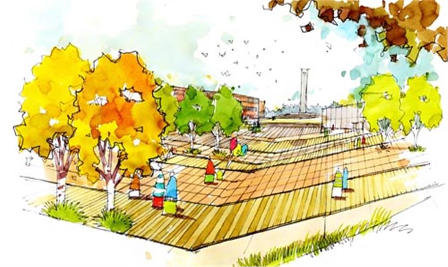 校區(qū)主要戶外活動空間的設(shè)計師法自然,依托山形展開,使用現(xiàn)代的設(shè)計語言抽象表達(dá)山形,層層綠帶逐漸跌落。