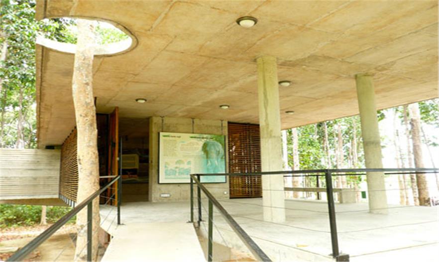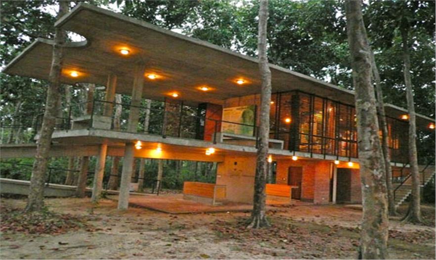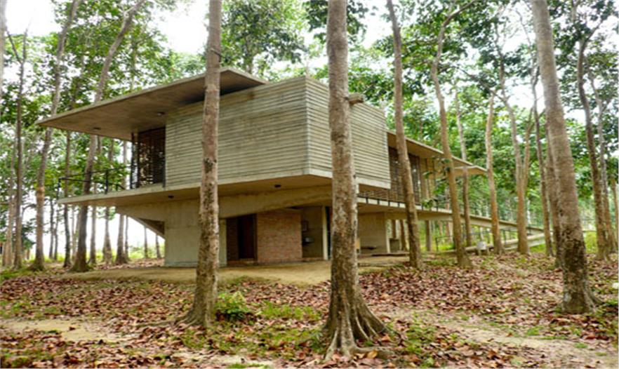 該項(xiàng)目位于孟加拉國南部吉大港區(qū)的一個(gè)森林和自然保護(hù)區(qū)內(nèi),主要用于自然教育和旅游服務(wù),并努力營造保護(hù)意識(shí)和推動(dòng)生物多樣性、保護(hù)和生態(tài)旅游。Nishorgo意思是孟加拉的環(huán)境,工程的中心概念也是保護(hù)大自然的神圣性。建筑本身被敏銳地至于環(huán)境中:鋼筋混凝土平臺(tái)置于地面的結(jié)構(gòu)墻之上,必要時(shí)樹干穿過混凝土板,這些都反映了建筑盡可能對(duì)周圍環(huán)境產(chǎn)生小的影響。游客走上平臺(tái),可以在高處觀察周圍環(huán)境。展覽區(qū)域設(shè)置在結(jié)構(gòu)安排形成的由木條建造的洞口中,并有一堵用燒制的粘土磚制成的墻可以用來觀看電影。