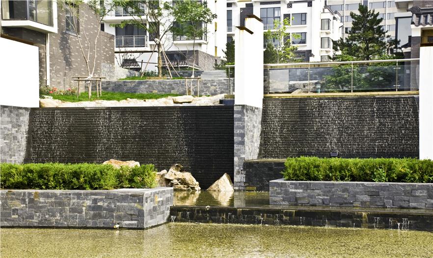 走至湖水正北處,奇石聳立,高墻跌水四季不斷,湖面三米高處挑一個平臺,可俯瞰湖景。