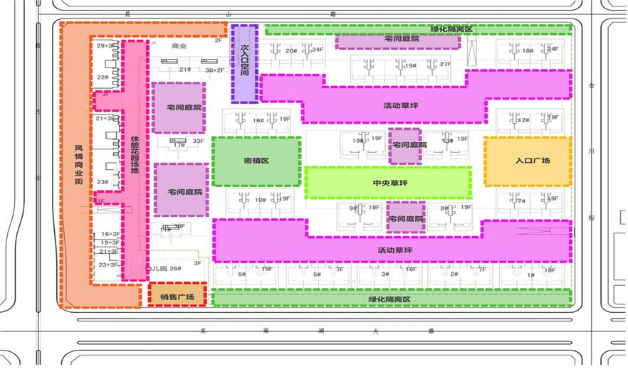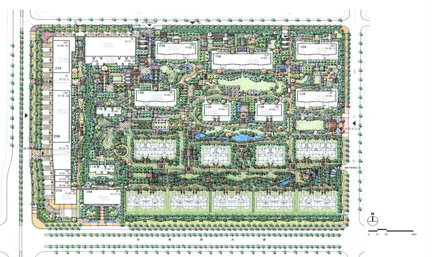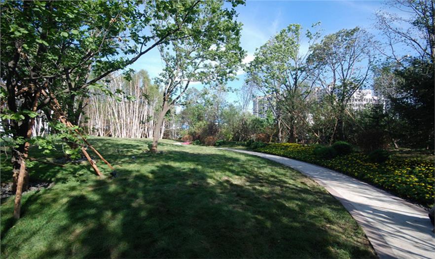 社區(qū)出入口簡潔大方,植物配置采用規(guī)則式種植,營造出端莊大氣的氛圍;宅間綠化空間注重植物在色彩、形狀、肌理上的對比,季相變化明顯,同時把握好植物之間的層次和空間關(guān)系,營造出富有特色及人情味的視覺及參與空間,達到人與自然的和諧。