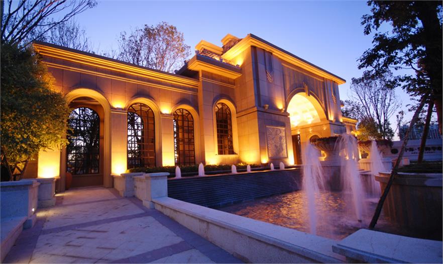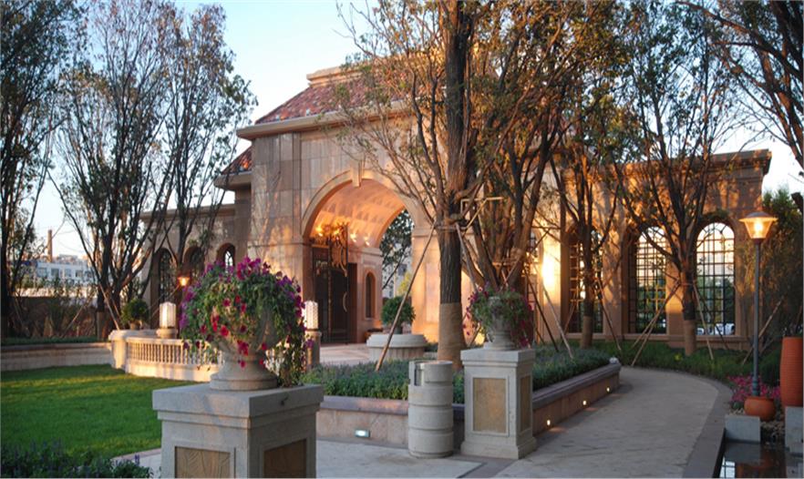 長春中海紫御華府演繹自然古典主義的豪宅社區(qū)。售樓處入口采用規(guī)則對稱式,嚴格按古典對稱設(shè)計手法,入口兩邊設(shè)置線性水景及大面積茂密景觀樹種植,曲徑通幽的小徑穿過種植林巧妙地到達入口。透過水景空間處理的收放有致,營造出多變和富有韻律感的景觀環(huán)境,輔以景觀燈柱、浮雕花缽,及特色噴泉的靈活應(yīng)用,將引人入勝的歐式皇家水陸風(fēng)情表現(xiàn)得淋漓盡致。