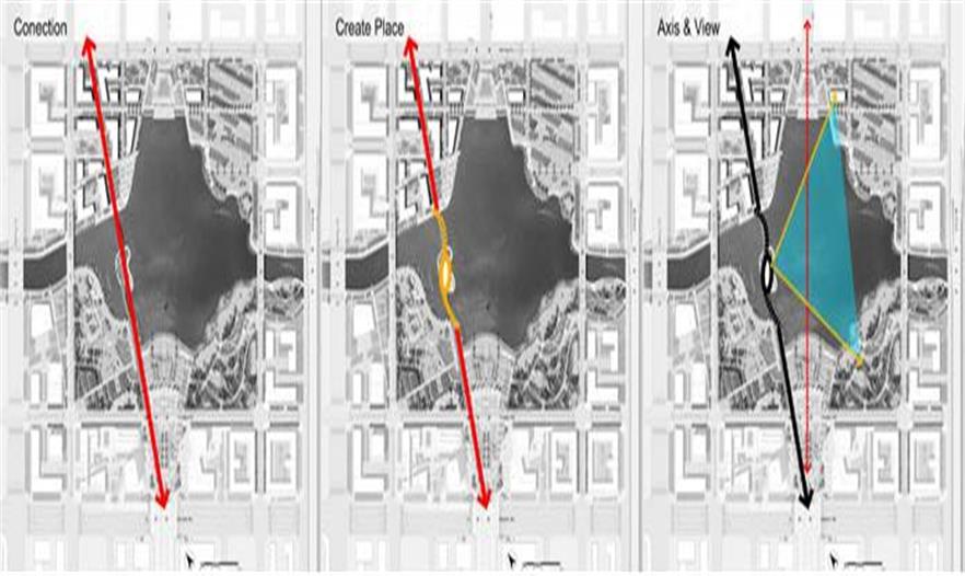 在規(guī)劃層面上,一條軸線斜跨整個(gè)中央公園,成為連接公園與此區(qū)域南北的最重要連接。此軸線南北斜跨九里河,步行橋架設(shè)于河中央。因?yàn)槲恢玫闹匾?,步行橋無疑要成為整個(gè)公園的重要步行連接與標(biāo)志物。