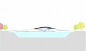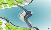 整個(gè)步行橋一體化設(shè)計(jì),流暢而富有動(dòng)感的形體激活了整個(gè)中央公園。步行橋平面被設(shè)計(jì)為S形狀,為穿越公園的人們提供一個(gè)對(duì)景,并創(chuàng)造出視覺中心點(diǎn),而非單一無聊直接看穿軸線兩端。同時(shí)步行橋給人們不僅僅提供了一個(gè)穿越的交通空間,中央局部放大,一體化的造型并提供雨棚,也提供一個(gè)駐足停留的觀景場所。橋身中部放寬,一個(gè)茶室便巧妙地布置于橋墩下,達(dá)到功能、空間、結(jié)構(gòu)的整合。