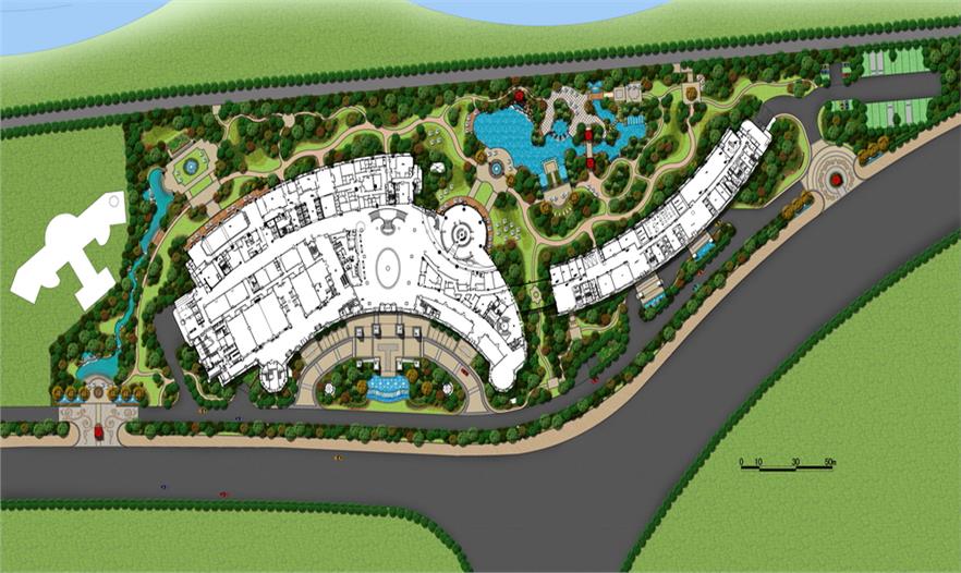 項目南面與市政道路有一定的高差,形成了天然的領域感。酒店建筑為新古典風格,景觀設計延續(xù)并強化了建筑風格所特有的奢華感,在入口處以大面積水景突顯奢華氣勢,在小品、鋪裝、單體等細部設計上體現(xiàn)星級品質,并充分利用場地現(xiàn)有資源,如利用高差形成層級綠化,利用起伏的坡地綠化形成步移景異的空間,因借外部江景形成外江內庭的格局,營造出生態(tài)的度假氛圍。