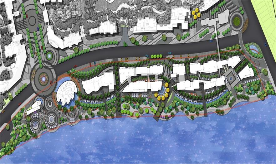 在植物空間的設(shè)計(jì)上,最初的想法是以動(dòng)態(tài)的中線劃分商業(yè)內(nèi)街與臨江休閑帶,并以帶狀的植物群落劃分這兩個(gè)空間。但考慮到整個(gè)項(xiàng)目的建筑群落對(duì)南岸起到展示性的效果,所以打破了隔斷,形成一條視線通廊,讓項(xiàng)目的建筑與景觀一覽無(wú)余。