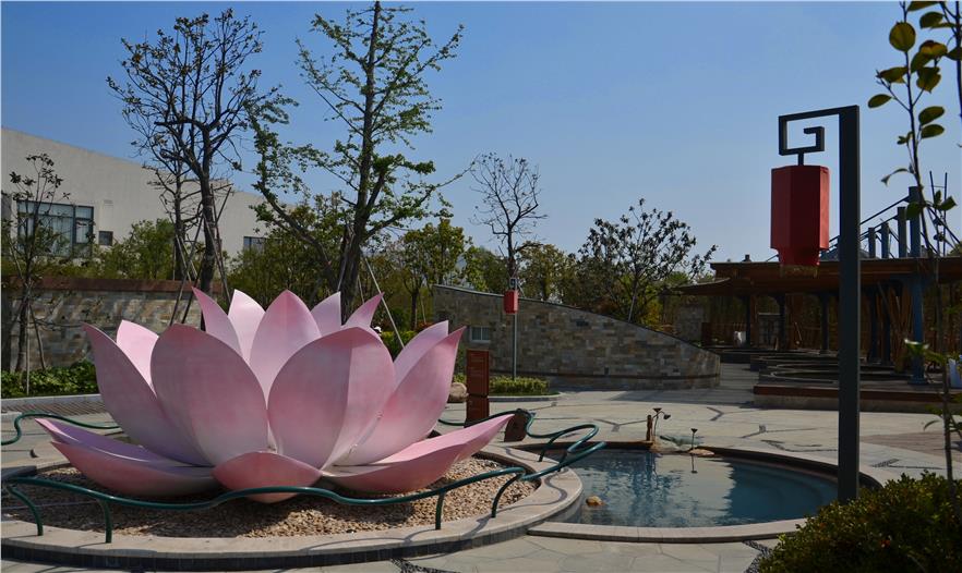 濕地植物——荷花:利用荷花的造型延展于各個(gè)景觀設(shè)計(jì)元素中,包括各種不同圖案的組合構(gòu)圖、小品雕塑、燈具及地面鋪裝等,以突出地域生態(tài)和文化特色。