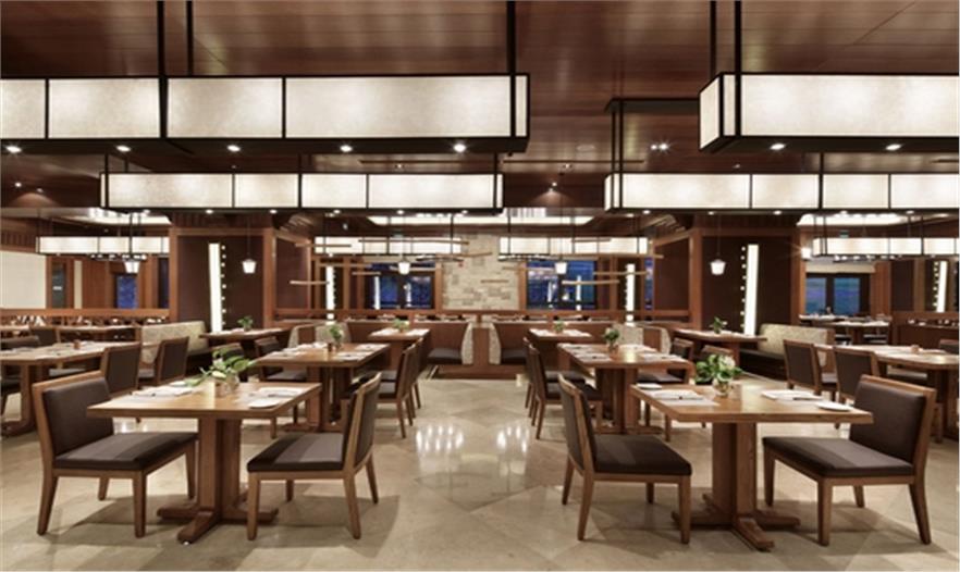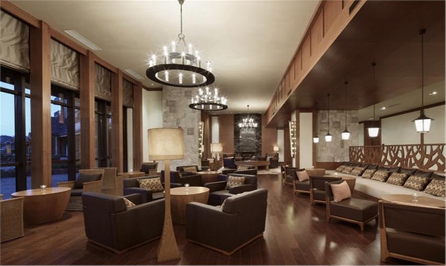 The linear arrangement of the All Day Dining Restaurant, again with wood strip flooring, two toned wood paneled walls and patterned wooden screens, offers a variety of seating options along a floor to ceiling window wall with fabulous views of the mountain. The Ski Bar, located at the end of one of the three wings of the hotel and planned so that it is at the foot of one of the ski runs, is an ideal spot for much needed refreshment after a hard days exercise or for late night reveling. The island bar surrounded by comfortable leather armchairs and bar stool type seating is enveloped by stone clad walls and a soaring wood framed ceiling creating a cozy, warm and safe environment for the all too familiar act of relaxation.
